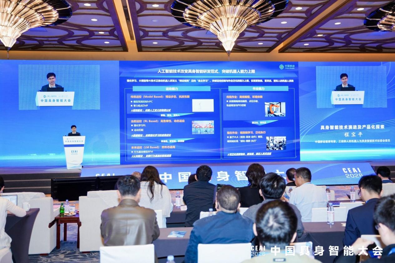 中国移动首席专家、中国移动具身智能产业创新中心具身智能产品部总经理程宝平出席大会并发表题为《具身智能技术演进及产品化探索》的主题演讲,分享中国移动在具身智能领域的技术布局、创新突破与产品化实践。