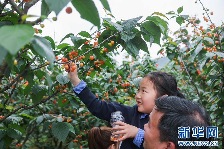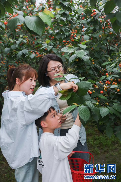 4月18日,游客在赵家镇的樱桃园里采摘首批成熟的樱桃。
