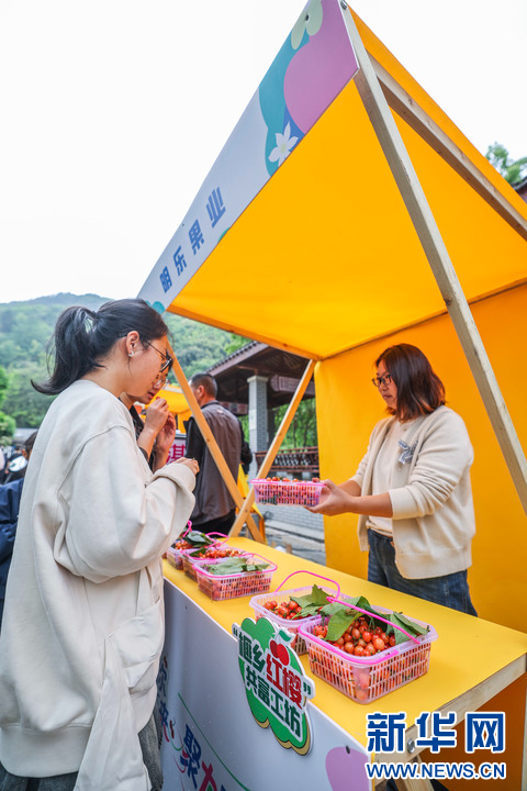 4月18日,樱桃采摘季的共富市集展销赵家镇当地农特产品。