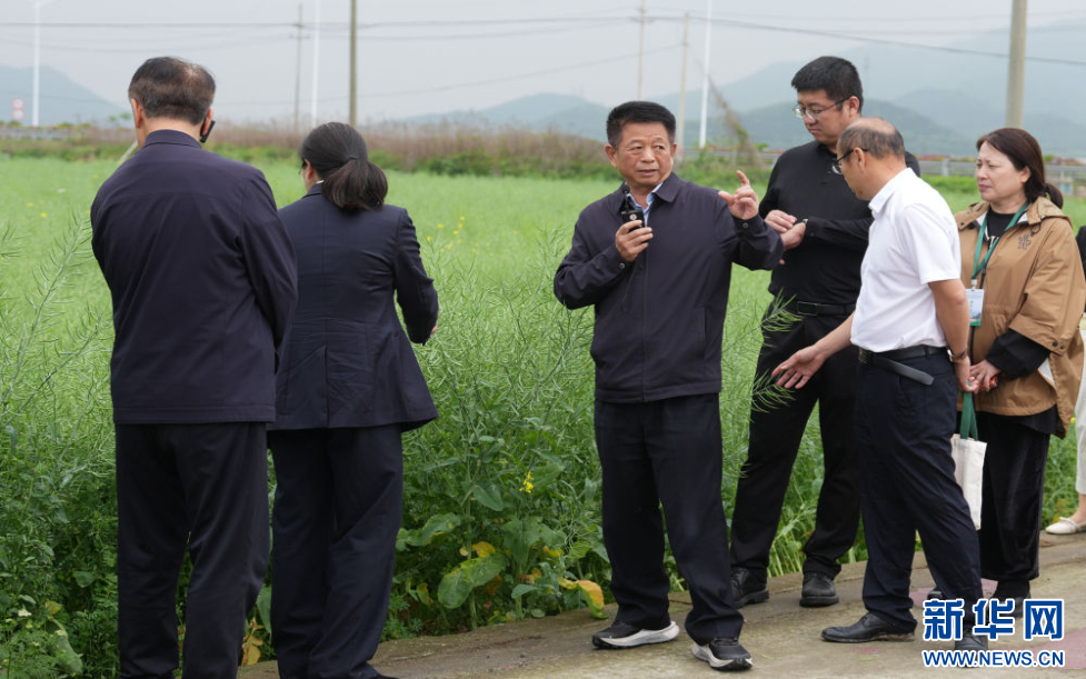 4月18日,油菜遗传育种学家,中国工程院院士王汉中(左三)在宁波市象山县涂茨镇科研基地点评油菜大面积单产提升技术。