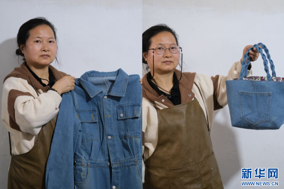 经过章苏美的改造,旧牛仔衣变身环保袋。新华社记者 段菁菁 摄
