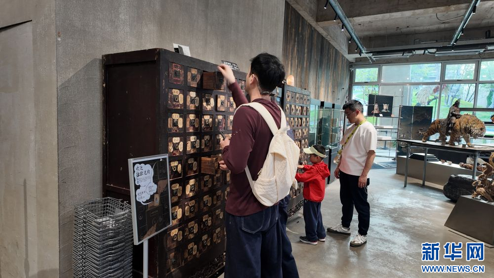 4月19日,一名消费者在中药柜改造的徽章展柜前,体验“拉开抽屉”的互动设计。新华社记者张璇 摄