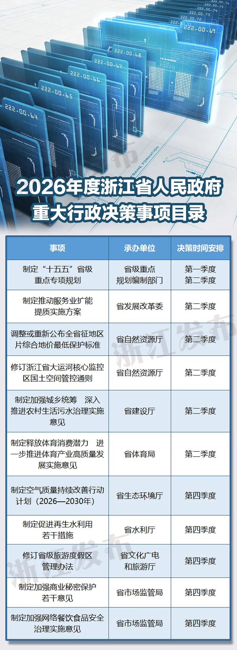 原标题:《11项!2026年度浙江省政府重大行政决策事项目录公布》