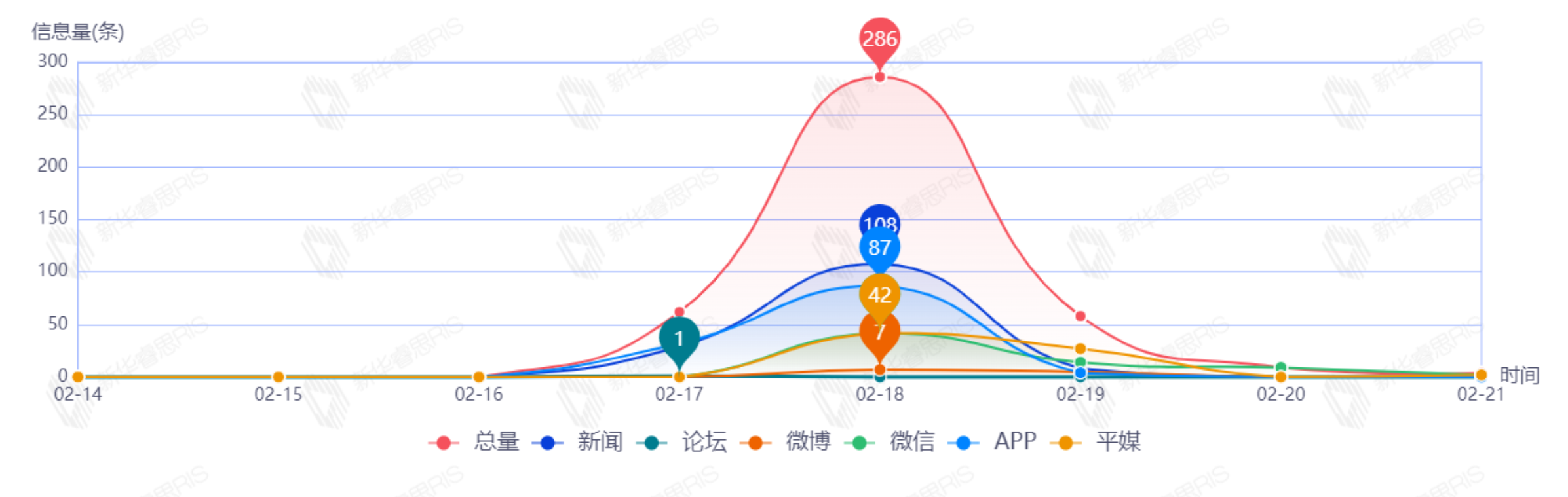 截至目前,该文章在互联网上传播总量为419篇,其中2月18日是信息发布的高峰期,发布信息量为286篇。各信源的信息发布情况中,新闻信息占比最大,其次是APP和平媒,信息量分别为145篇、123篇、71篇,占比分别为34.61%、29.36%、16.95%。(数据来源:新华睿思系统)