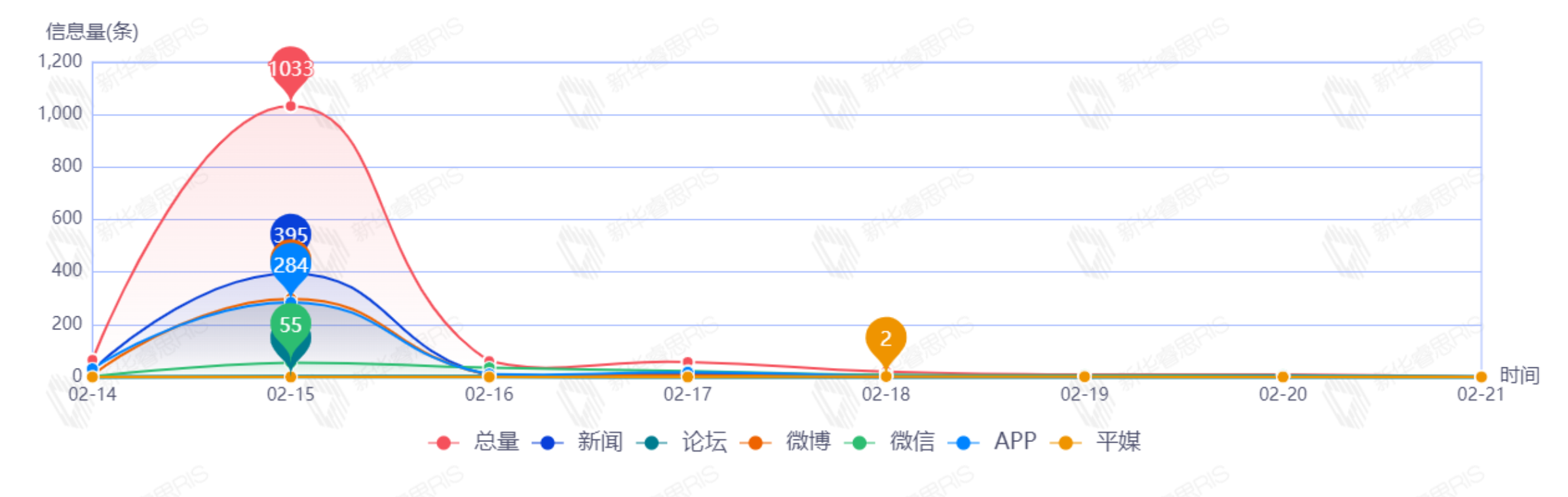 截至目前,该文章在互联网上传播总量为1254篇,其中2月15日是信息发布的高峰期,发布信息量为1033篇。各信源的信息发布情况中,新闻信息占比最大,其次是APP和微博,信息量分别为444篇、350篇、321篇,占比分别为35.43%、27.93%、25.62%。(数据来源:新华睿思系统)