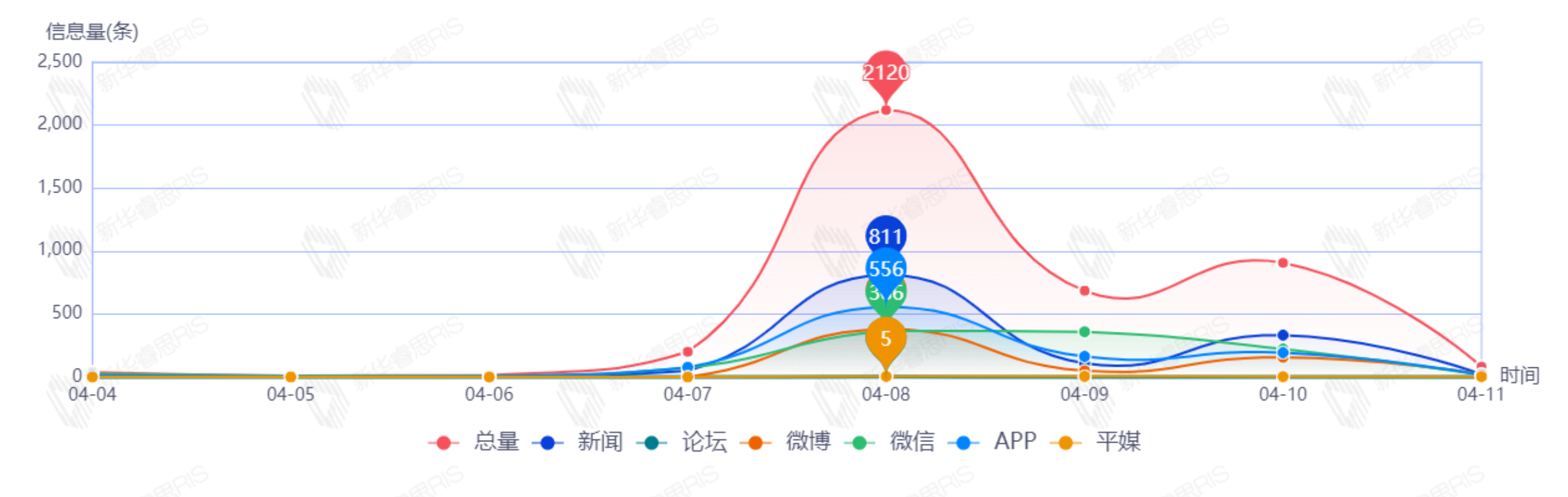 截至目前,该文章在互联网上传播总量为4054篇,其中4月8日是信息发布的高峰期,发布信息量为2120篇。各信源的信息发布情况中,新闻信息占比最大,其次是微信和APP,信息量分别为1324篇、1076篇、1026篇,占比分别为32.66%、26.54%、25.31%。(数据来源新华睿思系统)
