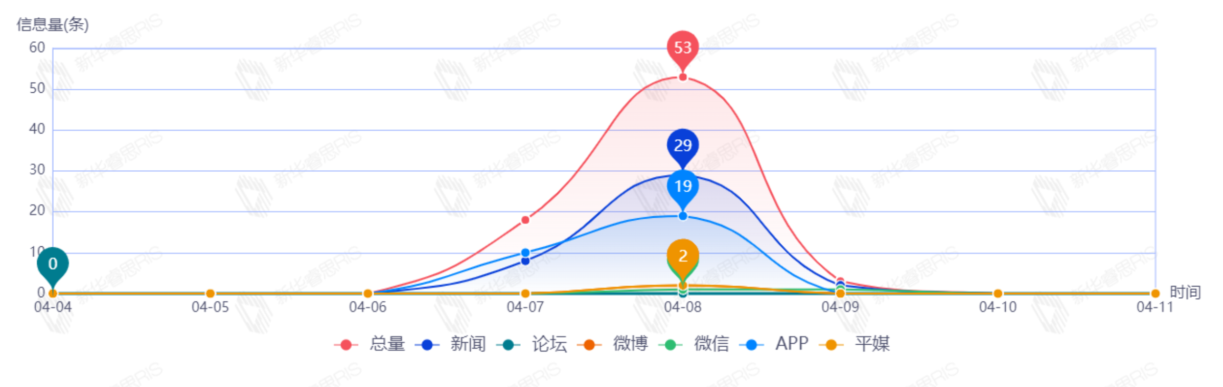 截至目前,该文章在互联网上传播总量为74篇,其中4月8是信息发布的高峰期,发布信息量为53篇。各信源的信息发布情况中,新闻信息占比最大,其次是APP和平媒,信息量分别为39篇、29篇、2篇,占比分别为52.70%、39.19%、2.70%。(数据来源:新华睿思系统)