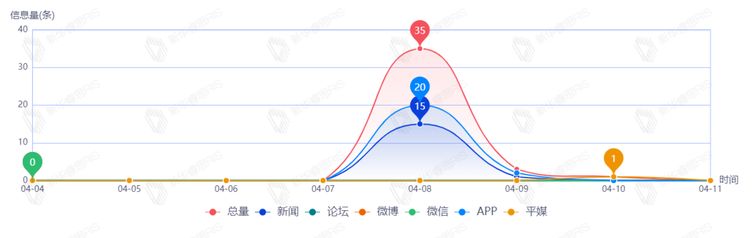 截至目前,该文章在互联网上传播总量为39篇,其中4月8日是信息发布的高峰期,发布信息量为35篇。各信源的信息发布情况中,APP信息占比最大,其次是新闻和平媒,信息量分别为22篇、16篇、1篇,占比分别为56.41%、41.03%、2.56%。(数据来源:新华睿思系统)