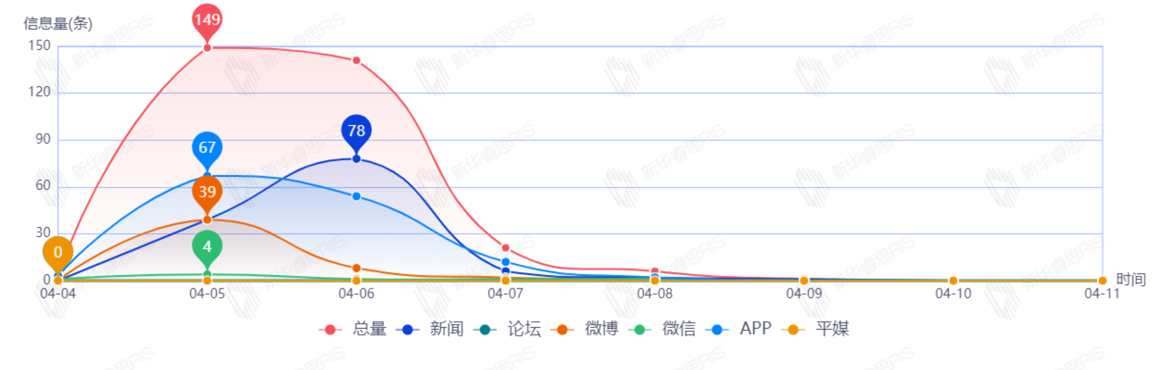 截至目前,该文章在互联网上传播总量为322篇,其中4月5日是信息发布的高峰期,发布信息量为149篇。各信源的信息发布情况中,APP信息占比最大,其次是新闻和微博,信息量分别为138篇、126篇、50篇,占比分别为42.86%、39.13%、15.53%。(数据来源:新华睿思系统)