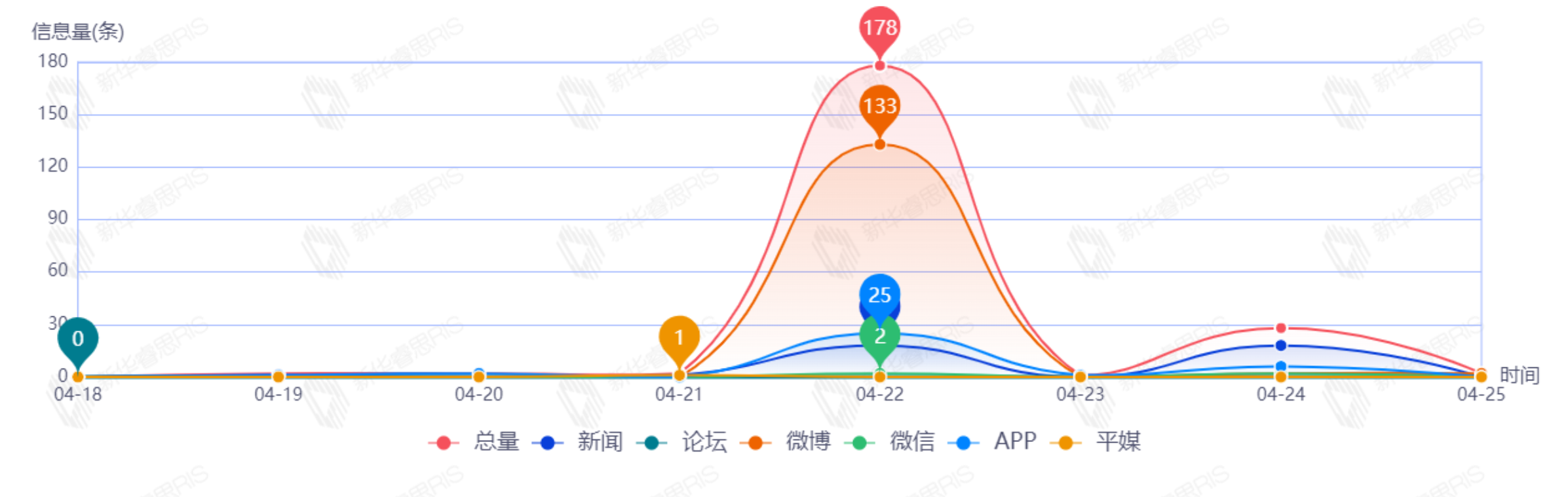 截至目前,该文章在互联网上传播总量为360篇,其中4月23日是信息发布的高峰期,发布信息量为128篇。各信源的信息发布情况中,新闻信息占比最大,其次是APP和微博,信息量分别为124篇、80篇、70篇,占比分别为34.54%、22.28%、19.50%。(数据来源:新华睿思系统)
