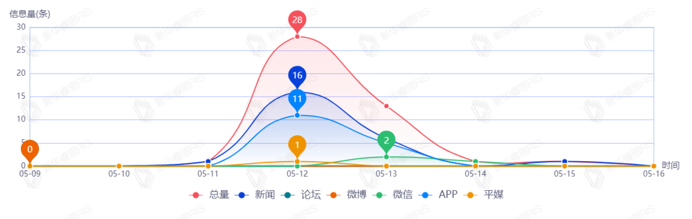 截至目前,该文章在互联网上传播总量为44篇,其中5月12日是信息发布的高峰期,发布信息量为28篇。各信源的信息发布情况中,新闻信息占比最大,其次是APP和微信,信息量分别为24篇、16篇、3篇,占比分别为54.55%、36.36%、6.82%。。(数据来源:新华睿思系统)