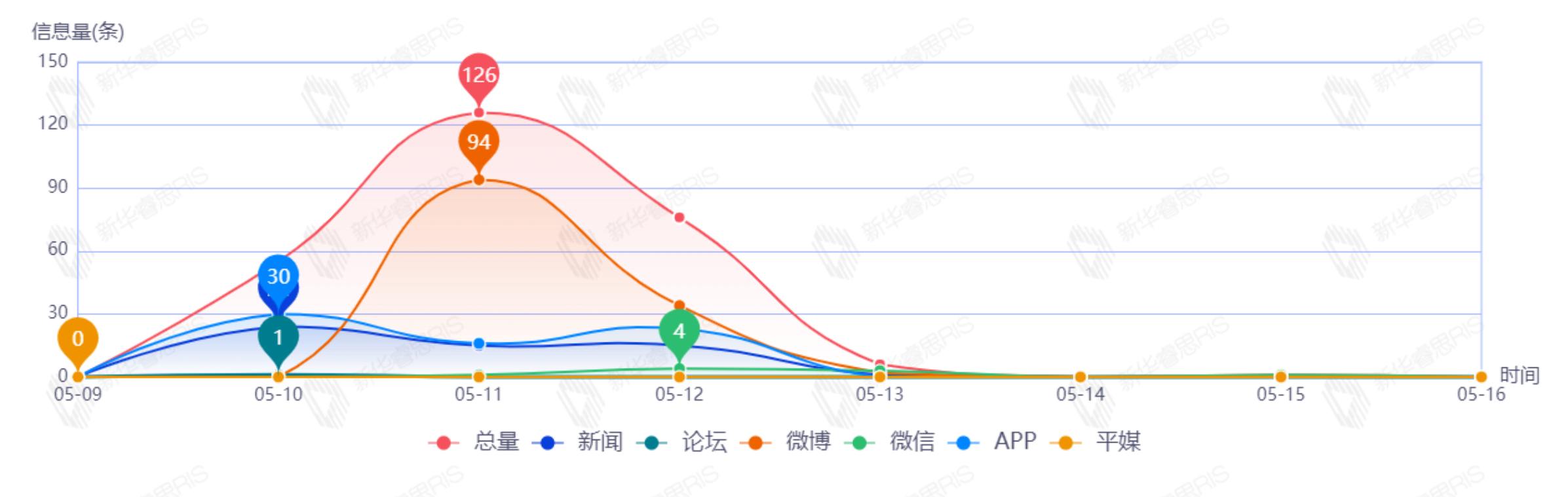 截至目前,该文章在互联网上传播总量为264篇,其中5月11日是信息发布的高峰期,发布信息量为126篇。各信源的信息发布情况中,微博信息占比最大,其次是APP和新闻,信息量分别为130篇、69篇、55篇,占比分别为49.24%、26.14%、20.83%。(数据来源:新华睿思系统)