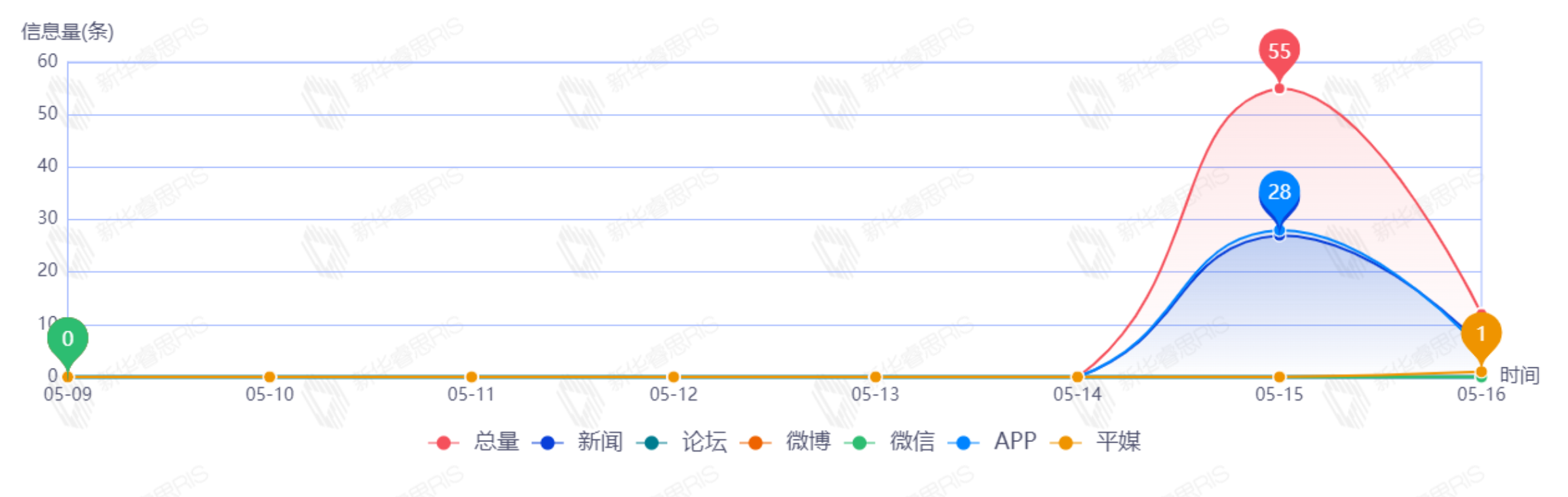 截至目前,该文章在互联网上传播总量为67篇,其中5月15日是信息发布的高峰期,发布信息量为55篇。各信源的信息发布情况中,新闻信息占比最大,其次是APP和微博,信息量分别为33篇、33篇、1篇,占比分别为49.25%、49.25%、1.49%。(数据来源:新华睿思系统)