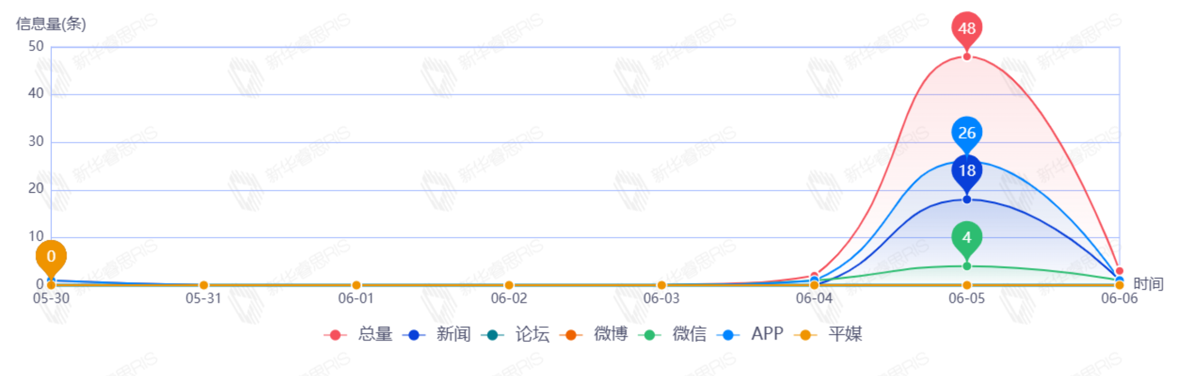 截至目前,该文章在互联网上传播总量为54篇,其中6月5日是信息发布的高峰期,发布信息量为48篇。各信源的信息发布情况中,APP信息占比最大,其次是新闻和微信,信息量分别为29篇、19篇、6篇,占比分别为53.70%、35.19%、11.11%。(数据来源:新华睿思系统)