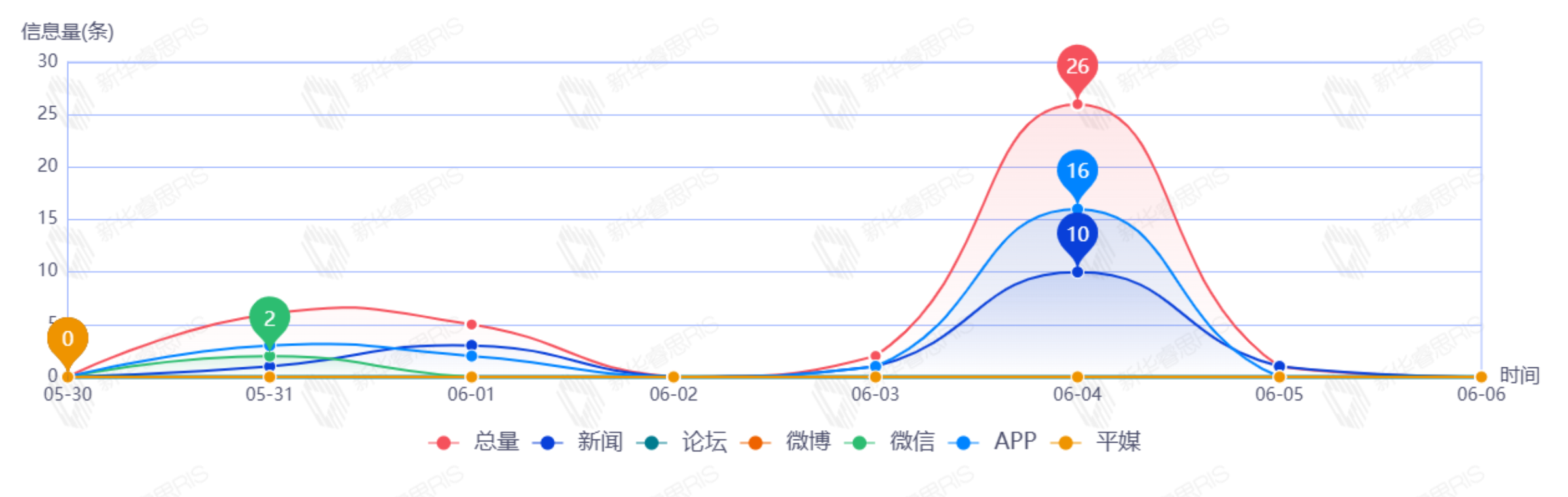截至目前,该文章在互联网上传播总量为404篇,其中6月4日是信息发布的高峰期,发布信息量为171篇。各信源的信息发布情况中,新闻信息占比最大,其次是APP和微信,信息量分别为170篇、136篇、73篇,占比分别为44.27%、35.42%、19.01%。(数据来源:新华睿思系统)