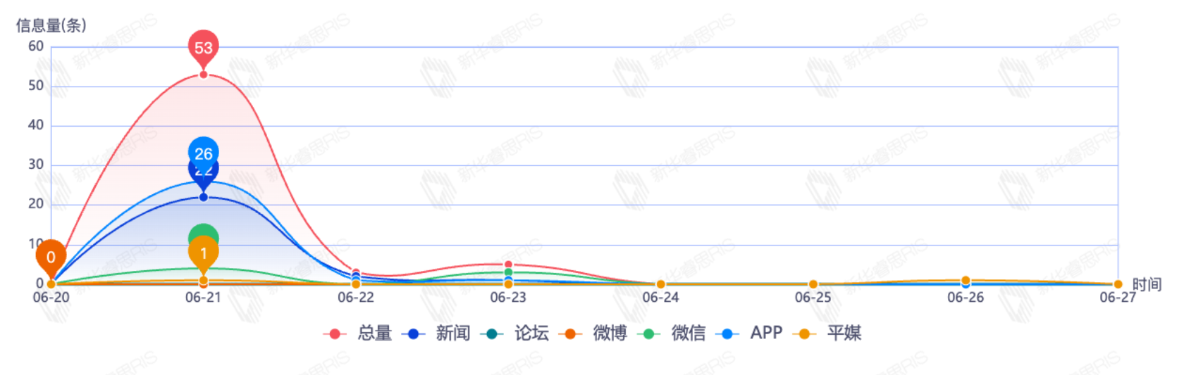 截至目前,该文章在互联网上传播总量为62篇,其中6月21日是信息发布的高峰期,发布信息量为53篇。各信源的信息发布情况中,APP信息占比最大,其次是新闻和微信,信息量分别为27篇、25篇、7篇,占比分别为44.26%、40.98%、11.48%。(数据来源:新华睿思系统)
