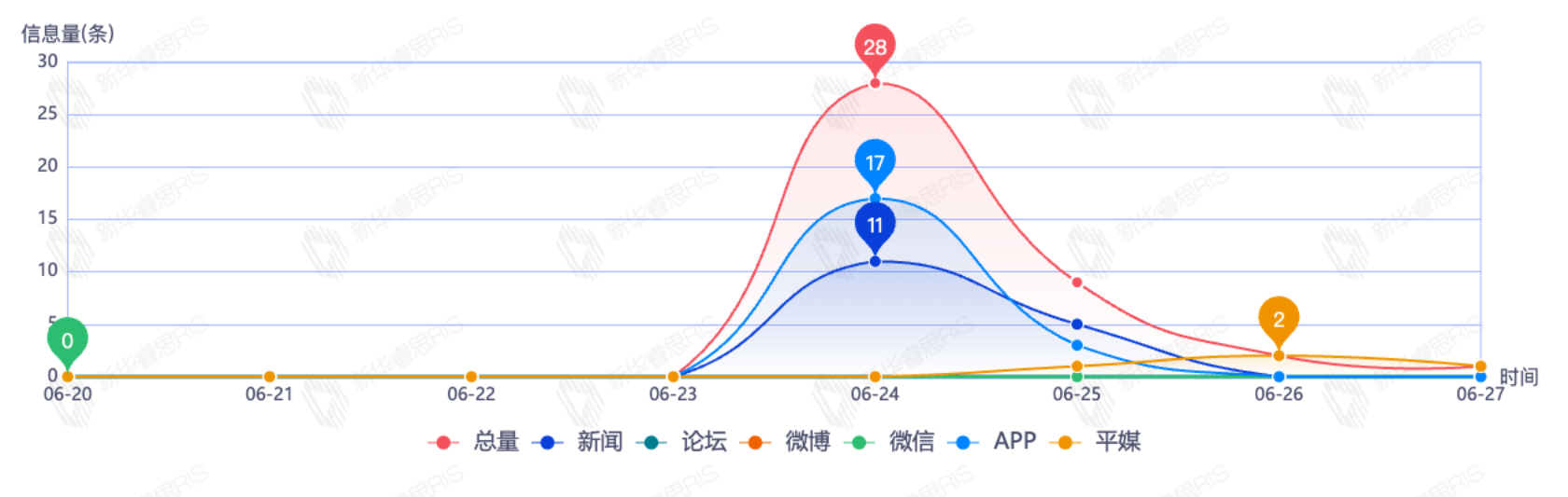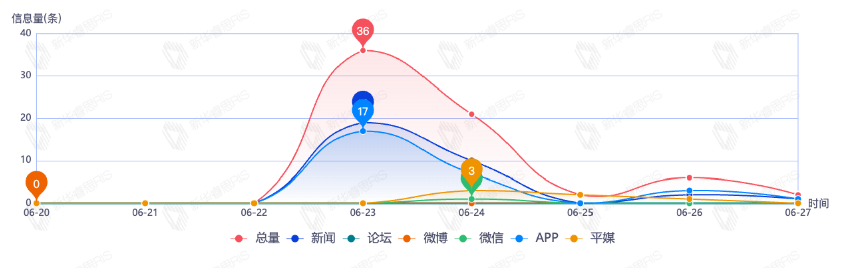 截至目前,该文章在互联网上传播总量为40篇,其中6月24日是信息发布的高峰期,发布信息量为28篇。各信源的信息发布情况中,新闻信息占比最大,其次是APP和平媒,信息量分别为16篇、16篇、4篇,占比分别为44.44%、44.44%、11.11%。(数据来源:新华睿思系统)