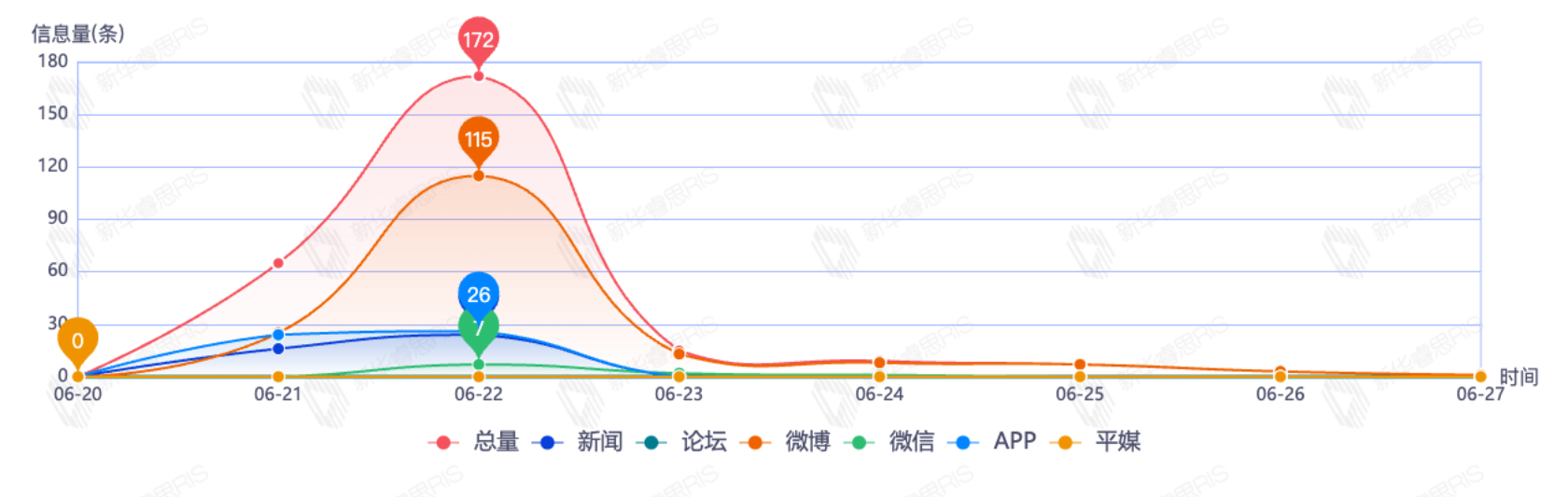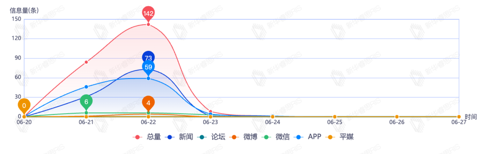 截至目前,该文章在互联网上传播总量为235篇,其中6月22日是信息发布的高峰期,发布信息量为142篇。各信源的信息发布情况中,新闻信息占比最大,其次是APP和微信,信息量分别为105篇、99篇、15篇,占比分别为46.88%、44.20%、6.70%。(数据来源:新华睿思系统)