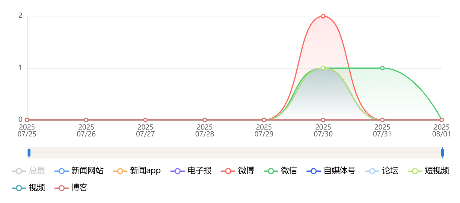 截至目前,该文章在互联网上传播总量为7篇,其中7月30日是信息发布的高峰期。各信源的信息发布情况中,微博信息占比最大,其次是微信和电子报,信息量分别为2篇、2篇、1篇,占比分别为28.57%、28.57%、14.29%。(数据来源:新华睿思系统)