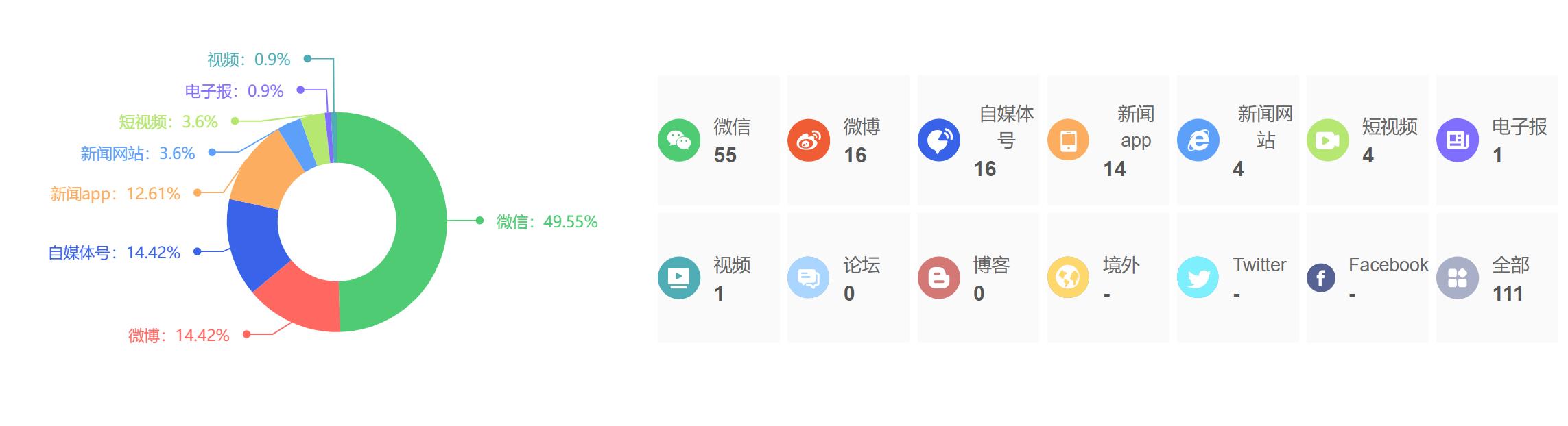 截至目前,该文章在互联网上传播总量为111篇,其中8月1日是信息发布的高峰期。各信源的信息发布情况中,微信信息占比最大,其次是微博和自媒体号,信息量分别为55篇、16篇、16篇,占比分别为49.55%、14.42%、14.42%。(数据来源:新华睿思系统)