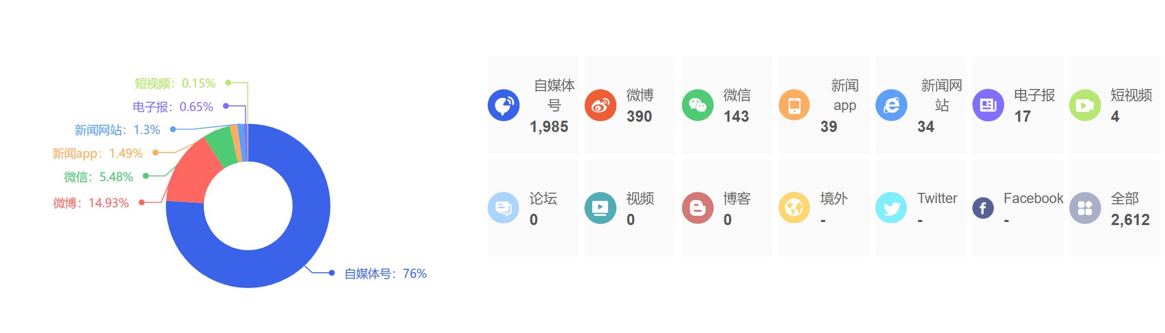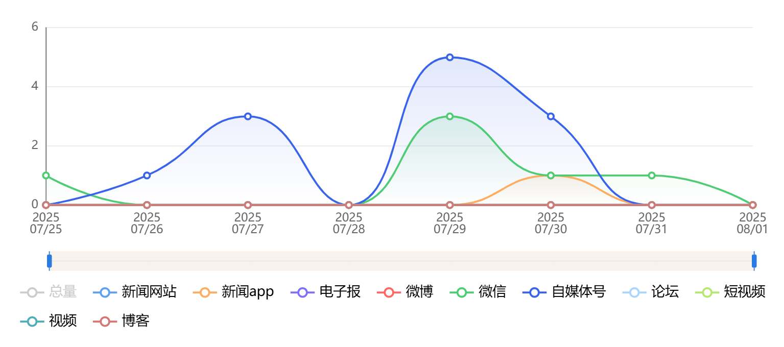 截至目前,该文章在互联网上传播总量为2612篇,其中7月28日是信息发布的高峰期。各信源的信息发布情况中,自媒体号信息占比最大,其次是微博和微信,信息量分别为1985篇、390篇、143篇,占比分别为76%、14.93%、5.48%。(数据来源:新华睿思系统)