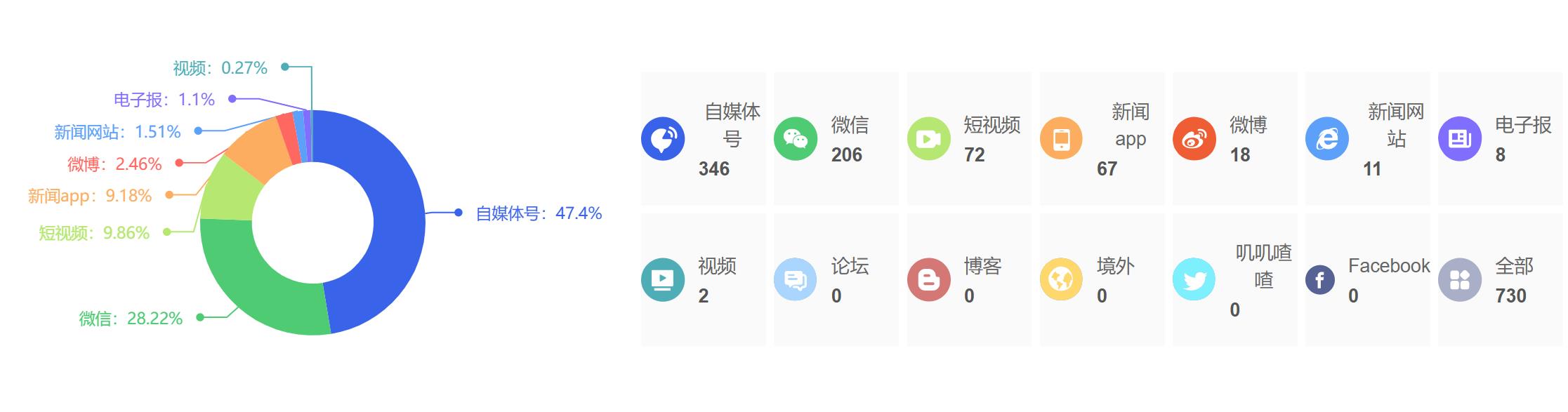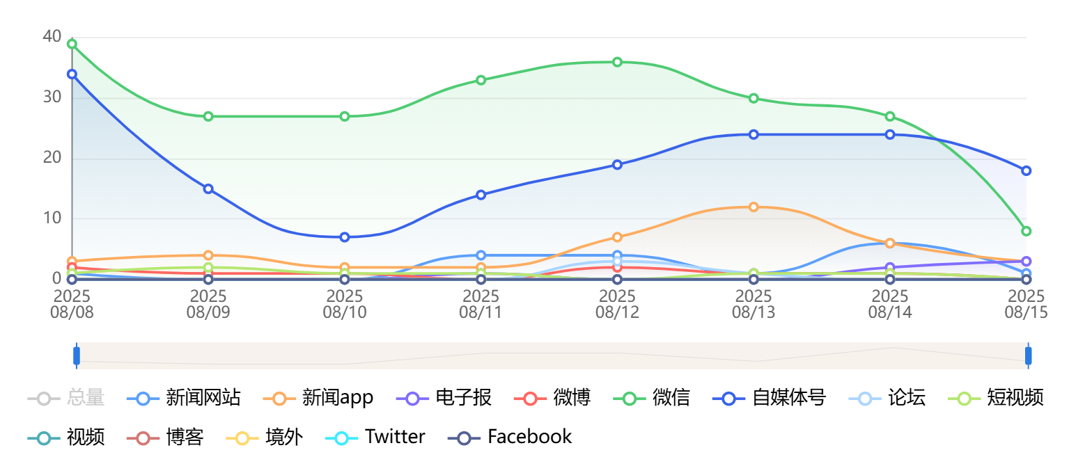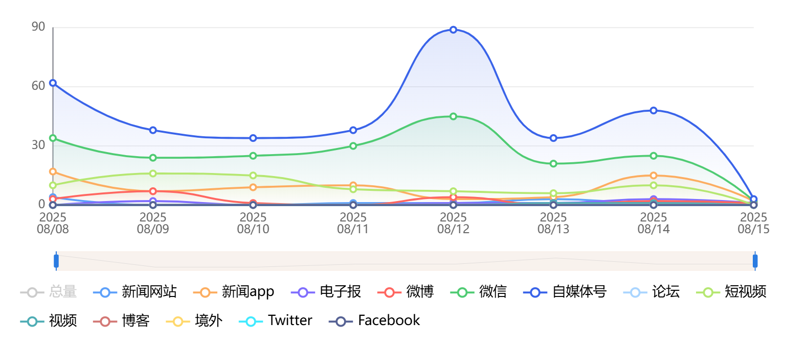 截至目前,该文章在互联网上传播总量为730篇,其中8月12日是信息发布的高峰期。各信源的信息发布情况中,自媒体号信息占比最大,其次是微信和短视频,信息量分别为346篇、206篇、72篇,占比分别为47.4%、28.22%、9.86%。(数据来源:新华睿思系统)