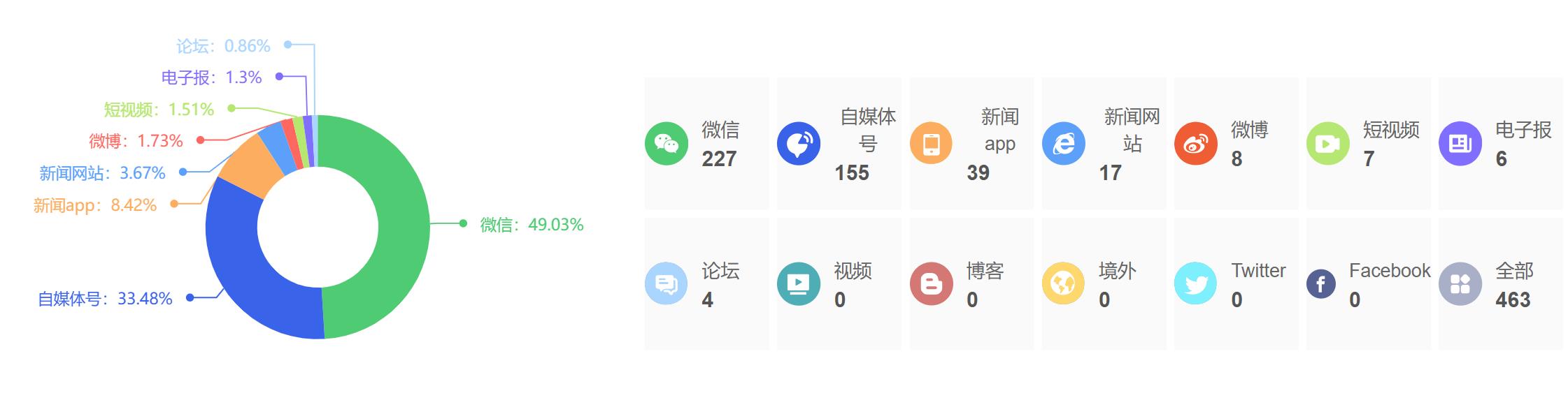 截至目前,该文章在互联网上传播总量为463篇,其中8月12日是信息发布的高峰期。各信源的信息发布情况中,微信信息占比最大,其次是自媒体号和新闻APP,信息量分别为227篇、155篇、39篇,占比分别为49.03%、33.48%、8.42%(数据来源:新华睿思系统)