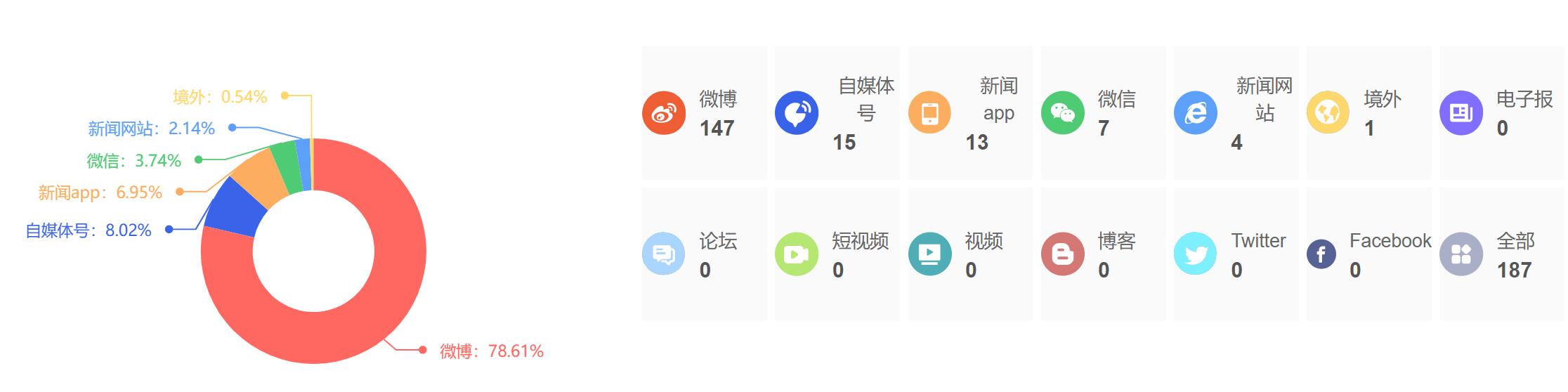截至目前,该文章在互联网上传播总量为187篇,其中8月13日是信息发布的高峰期。各信源的信息发布情况中,微博信息占比最大,其次是微信和电子报,信息量分别为147篇、15篇、13篇,占比分别为28.57%、28.57%、14.29%。(数据来源:新华睿思系统)