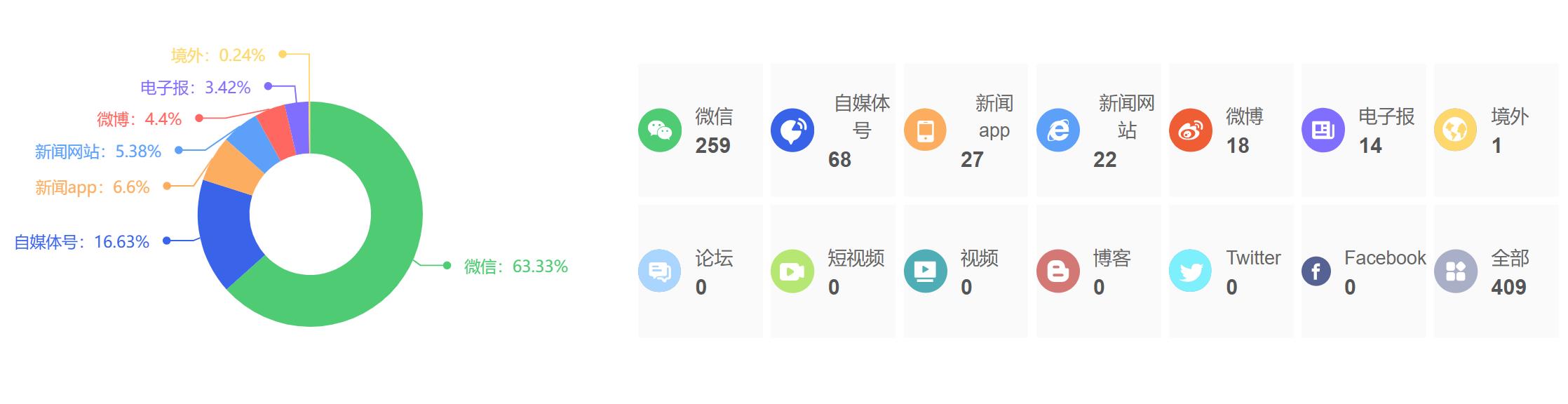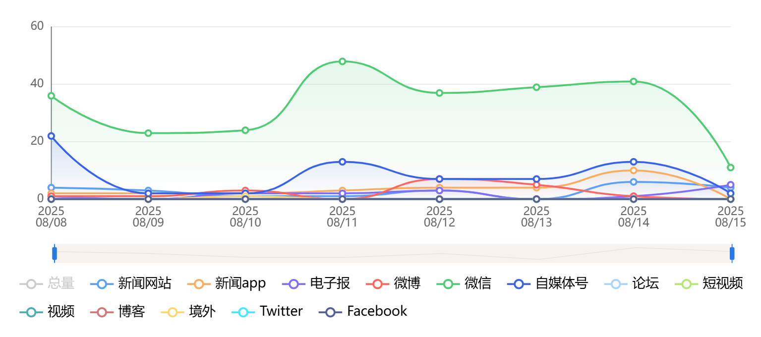 截至目前,该文章在互联网上传播总量为409篇,其中8月11日是信息发布的高峰期。各信源的信息发布情况中,微信信息占比最大,其次是自媒体号和新闻APP,信息量分别为259篇、68篇、27篇,占比分别为63.33%、16.63%、6.6%。(数据来源:新华睿思系统)