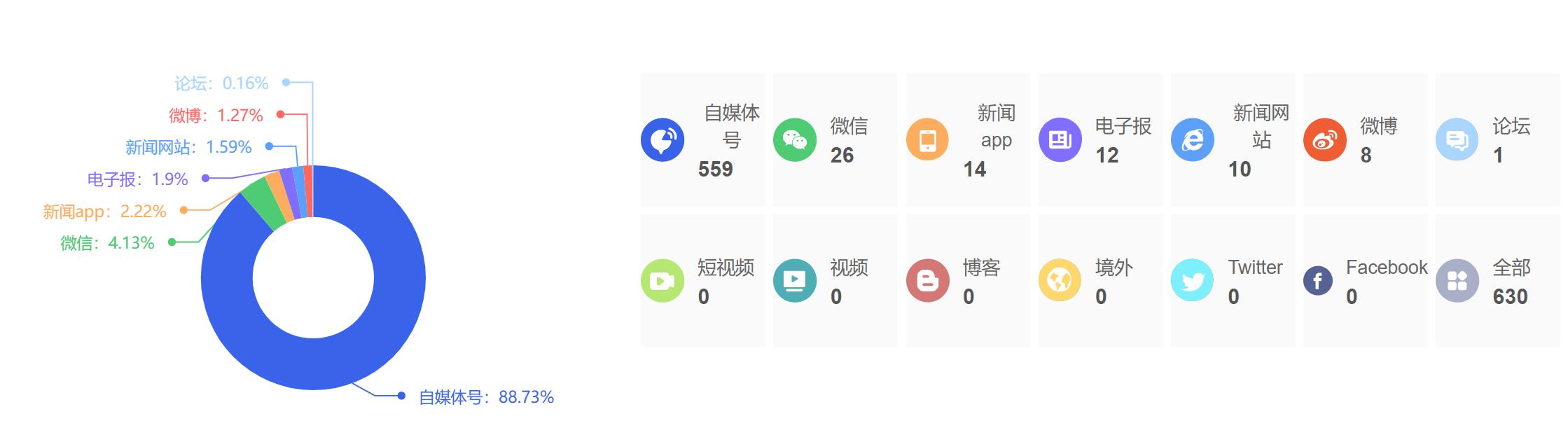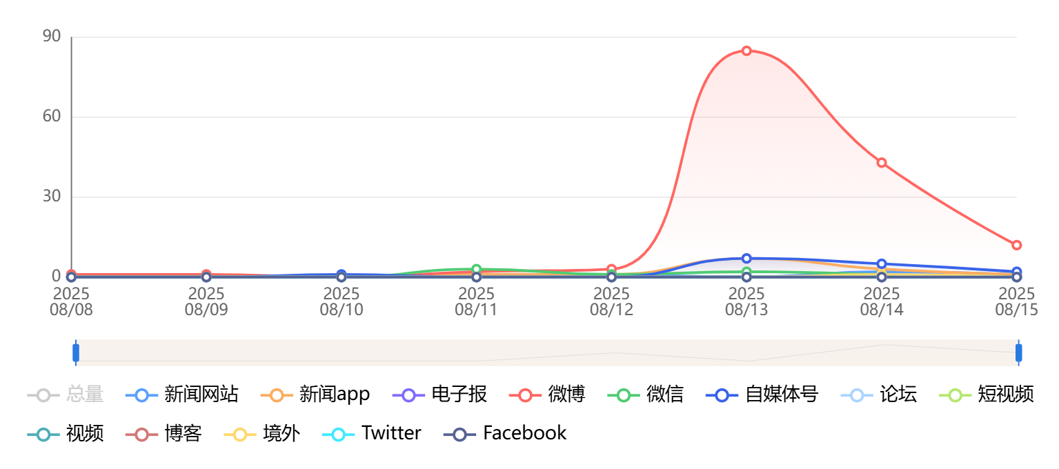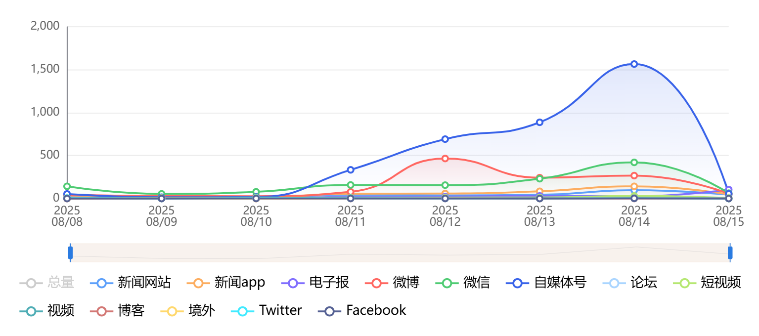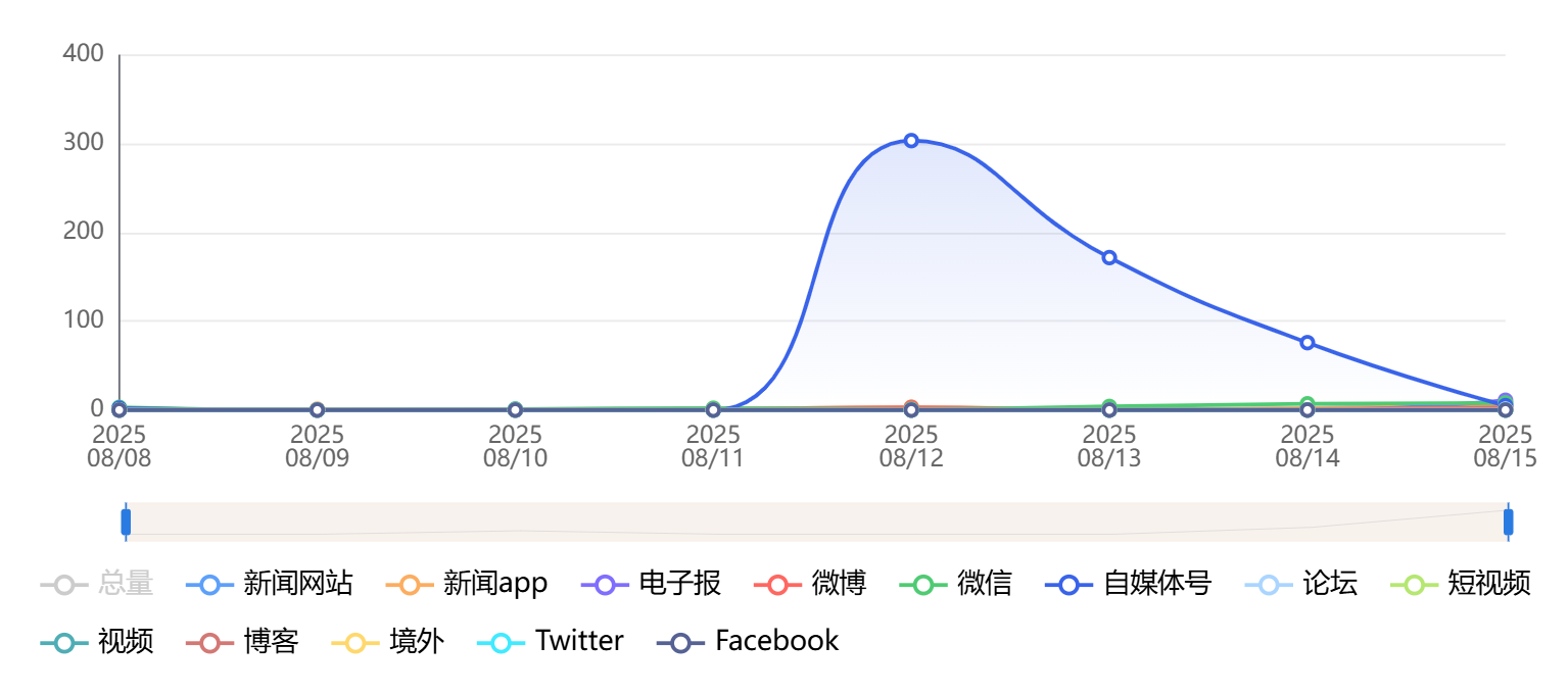 截至目前,该文章在互联网上传播总量为630篇,其中8月12日是信息发布的高峰期。各信源的信息发布情况中,自媒体号信息占比最大,其次是微信和新闻APP,信息量分别为559篇、26篇、14篇,占比分别为88.73%、4.13%、2.22%。(数据来源:新华睿思系统)