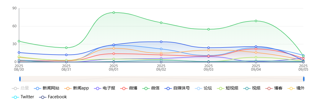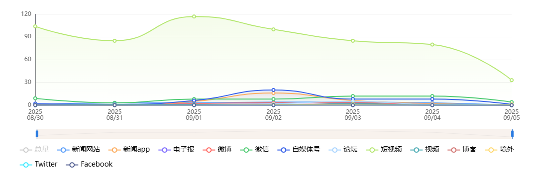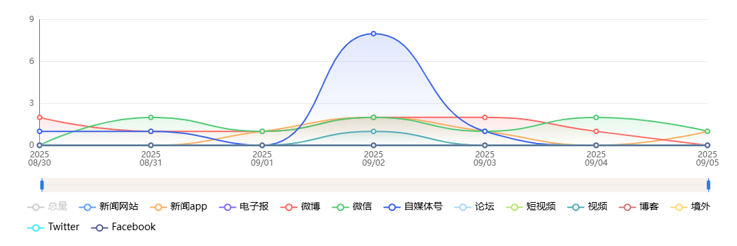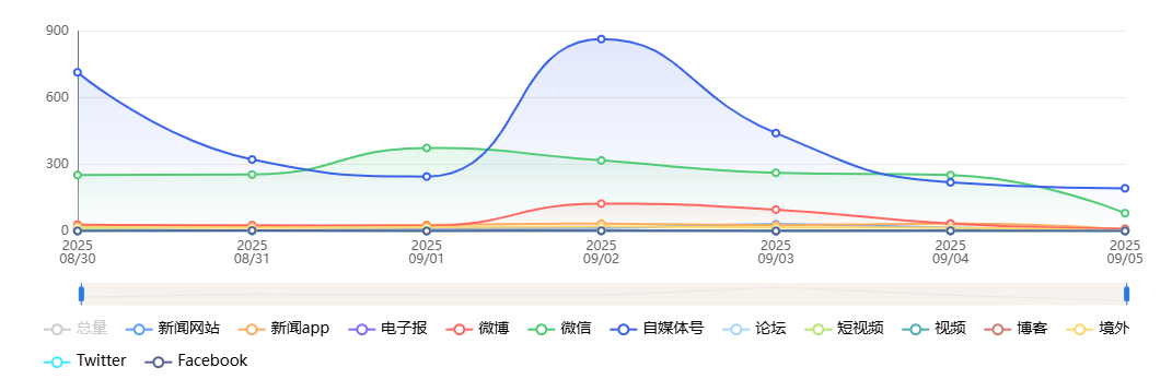 截至目前,该文章在互联网上传播总量为782篇,其中09-03是信息发布的高峰期。各信源的信息发布情况中,短视频占比最大,其次是微信和自媒体号,信息量分别为604、56、46,占比分别为77.24%、7.16%、5.88%。(数据来源:新华睿思系统)