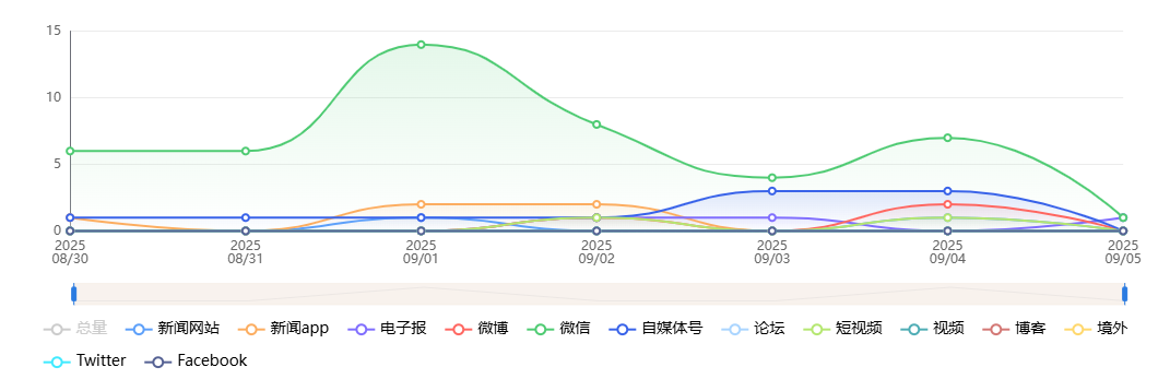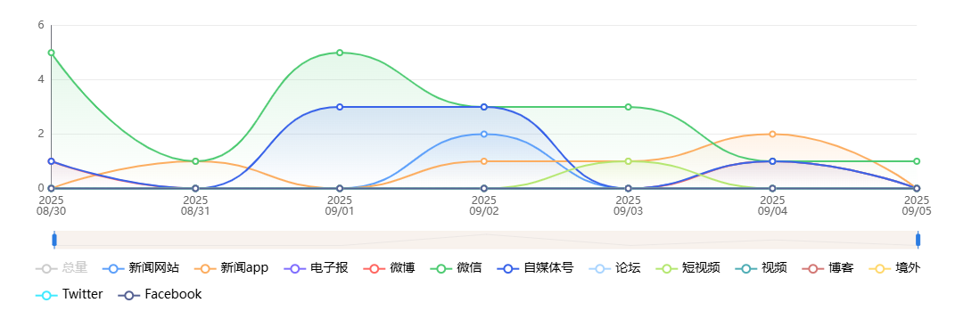 截至目前,该文章在互联网上传播总量为38篇,其中09-02是信息发布的高峰期。各信源的信息发布情况中,微信占比最大,其次是自媒体号和新闻APP,信息量分别为19、8、5,占比分别为50%、21.05%、13.16%。(数据来源:新华睿思系统)