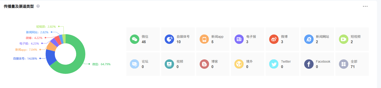 截至目前,该文章在互联网上传播总量为71篇,其中09-05是信息发布的高峰期。各信源的信息发布情况中,微信信息占比最大,其次是自媒体号和新闻APP,信息量分别为46、10、5,占比分别为64.79%、14.08%、7.04%。(数据来源:新华睿思系统)