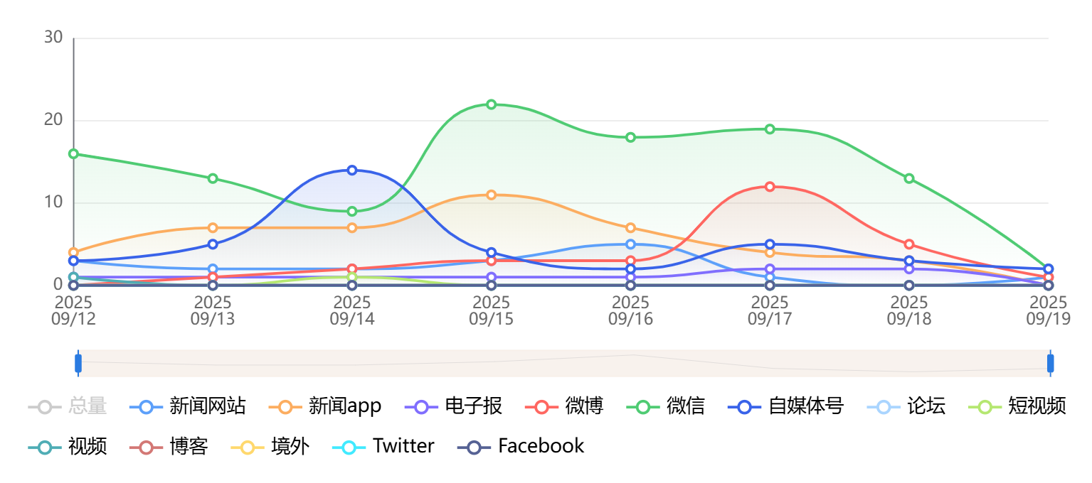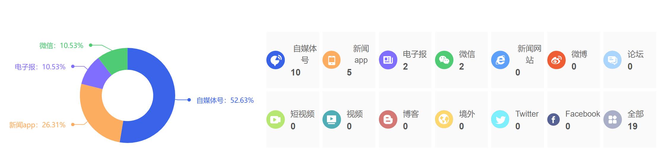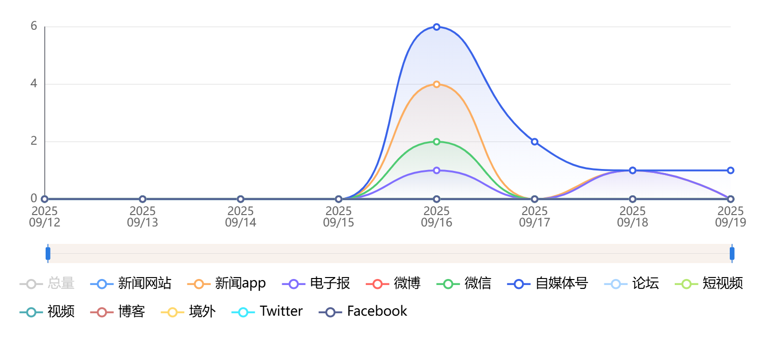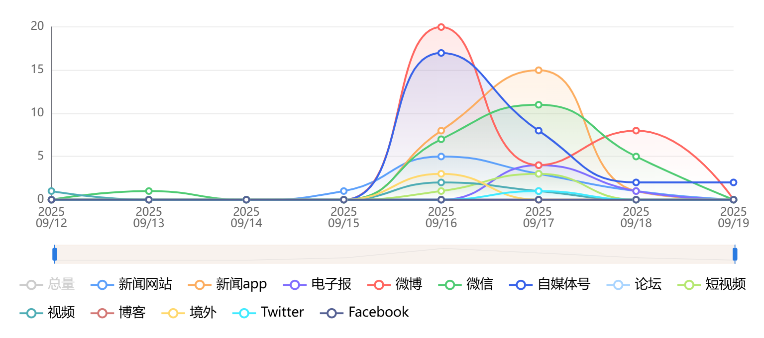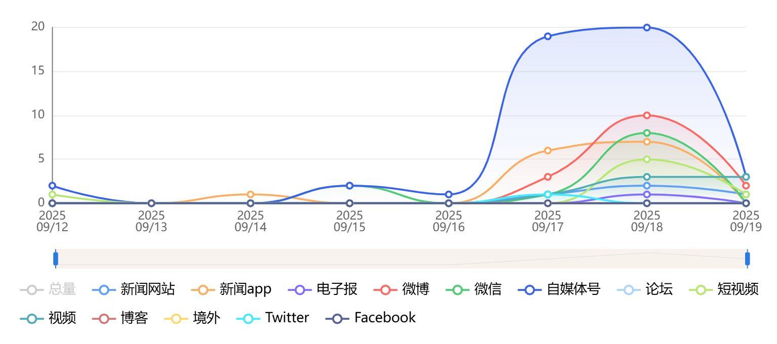 截至目前,该文章在互联网上传播总量为19篇,其中9月16日是信息发布的高峰期。各信源的信息发布情况中,自媒体号信息占比最大,其次是新闻APP和电子报,信息量分别为10篇、5篇、2篇,占比分别为52.63%、26.31%、10.53%。(数据来源:新华睿思系统)