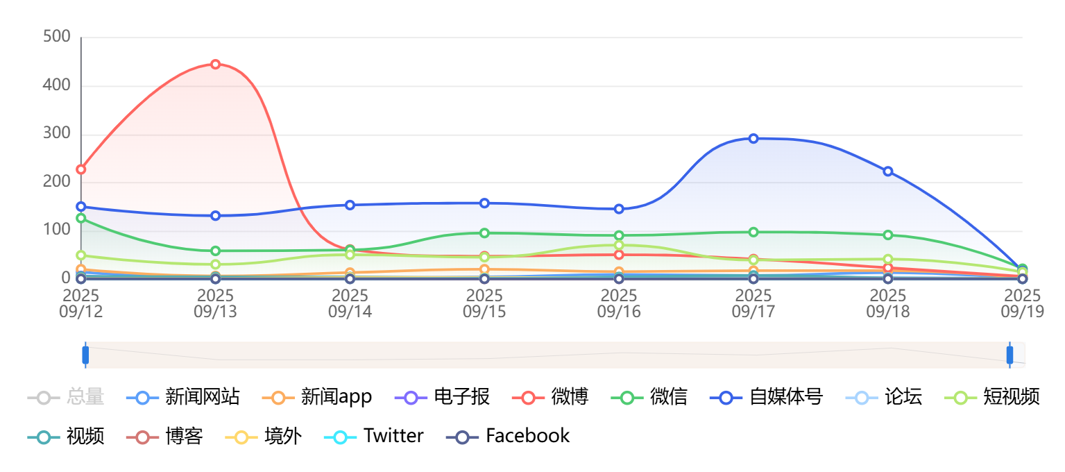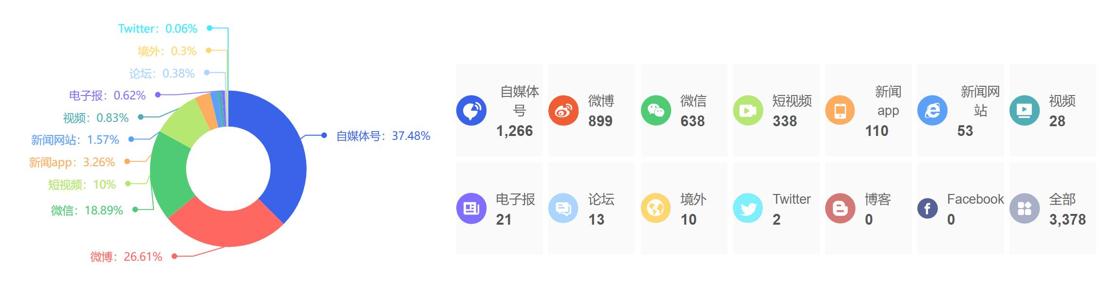 截至目前,该文章在互联网上传播总量为3378篇,其中9月13日是信息发布的高峰期。各信源的信息发布情况中,自媒体号信息占比最大,其次是微博和微信,信息量分别为1266篇、899篇、638篇,占比分别为37.48%、26.61%、18.89%。(数据来源:新华睿思系统)