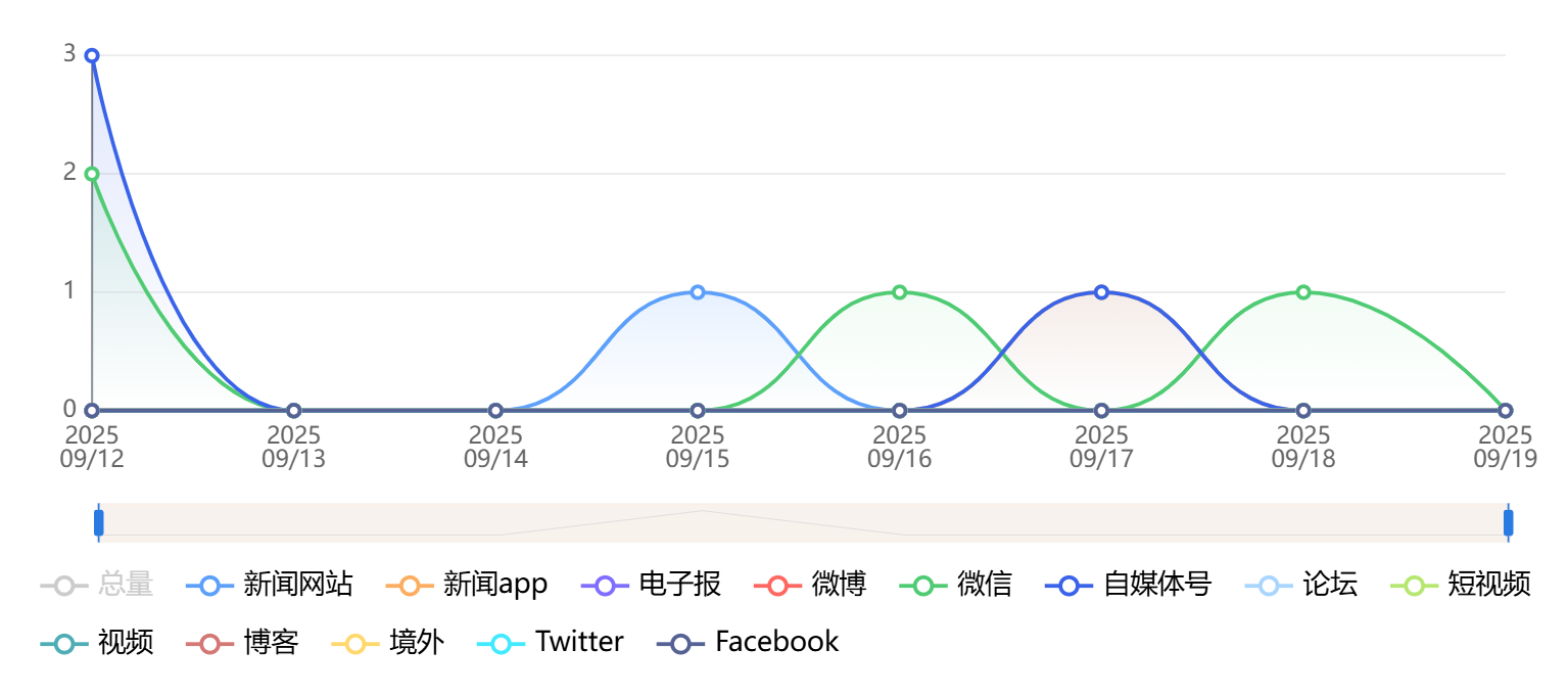 截至目前,该文章在互联网上传播总量为10篇,其中9月12日是信息发布的高峰期。各信源的信息发布情况中,微信信息占比最大,其次是自媒体号和新闻网站,信息量分别为4篇、4篇、1篇,占比分别为40%、40%、10%。(数据来源:新华睿思系统)
