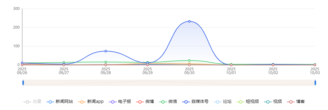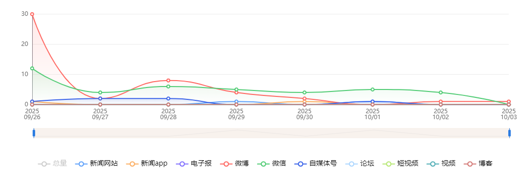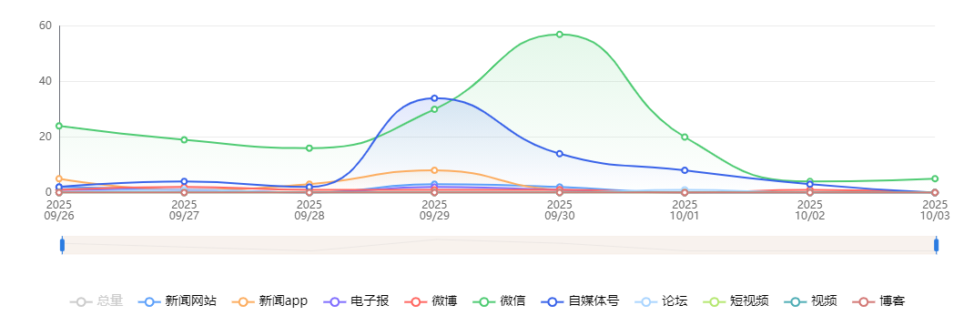 截至目前,该文章在互联网上传播总量为212篇,其中09-30是信息发布的高峰期。各信源的信息发布情况中,微信信息占比最大,其次是自媒体号和论坛,信息量分别为91、40、24,占比分别为42.93%、18.87%、11.32%。(数据来源:新华睿思系统)
