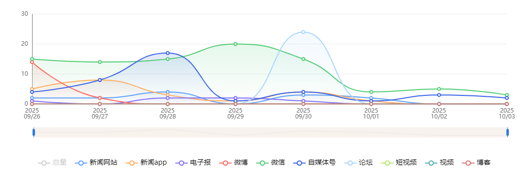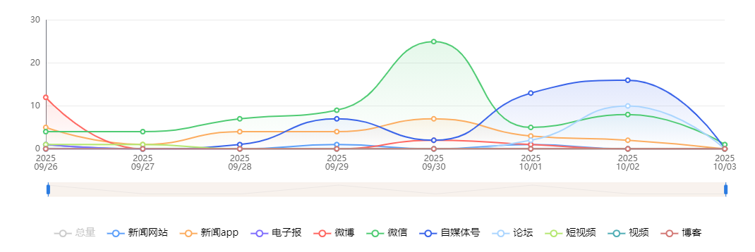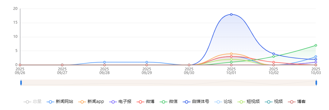 截至目前,该文章在互联网上传播总量161篇,其中10-01是信息发布的高峰期。各信源的信息发布情况中,其中微信信息占比最大,其次是自媒体号和新闻app,信息量分别为63、39、26,占比分别为39.13%、24.23%、16.15%。(数据来源:新华睿思系统)