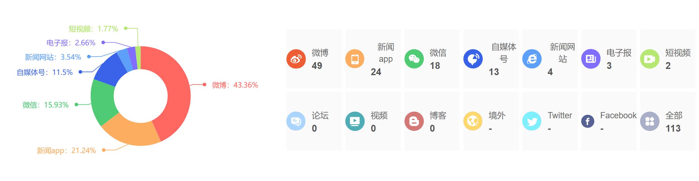 截至目前,该文章在互联网上传播总量为113篇,其中10月14日是信息发布的高峰期。各信源的信息发布情况中,微博信息占比最大,其次是新闻APP和微信,信息量分别为49篇、24篇、18篇,占比分别为43.36%、21.24%、15.93%。(数据来源:新华睿思系统)