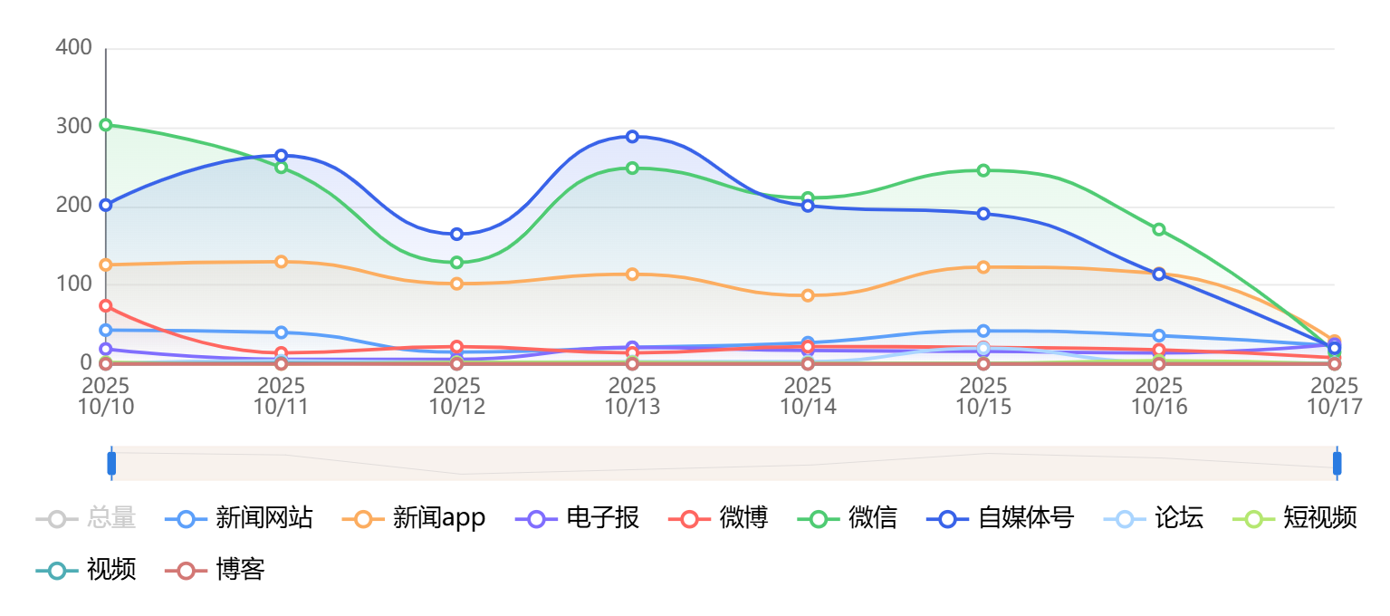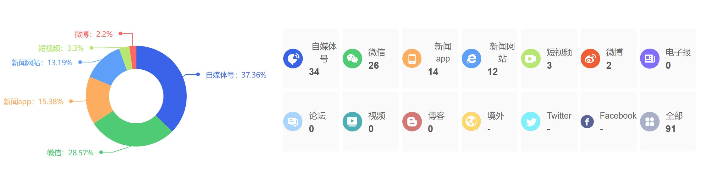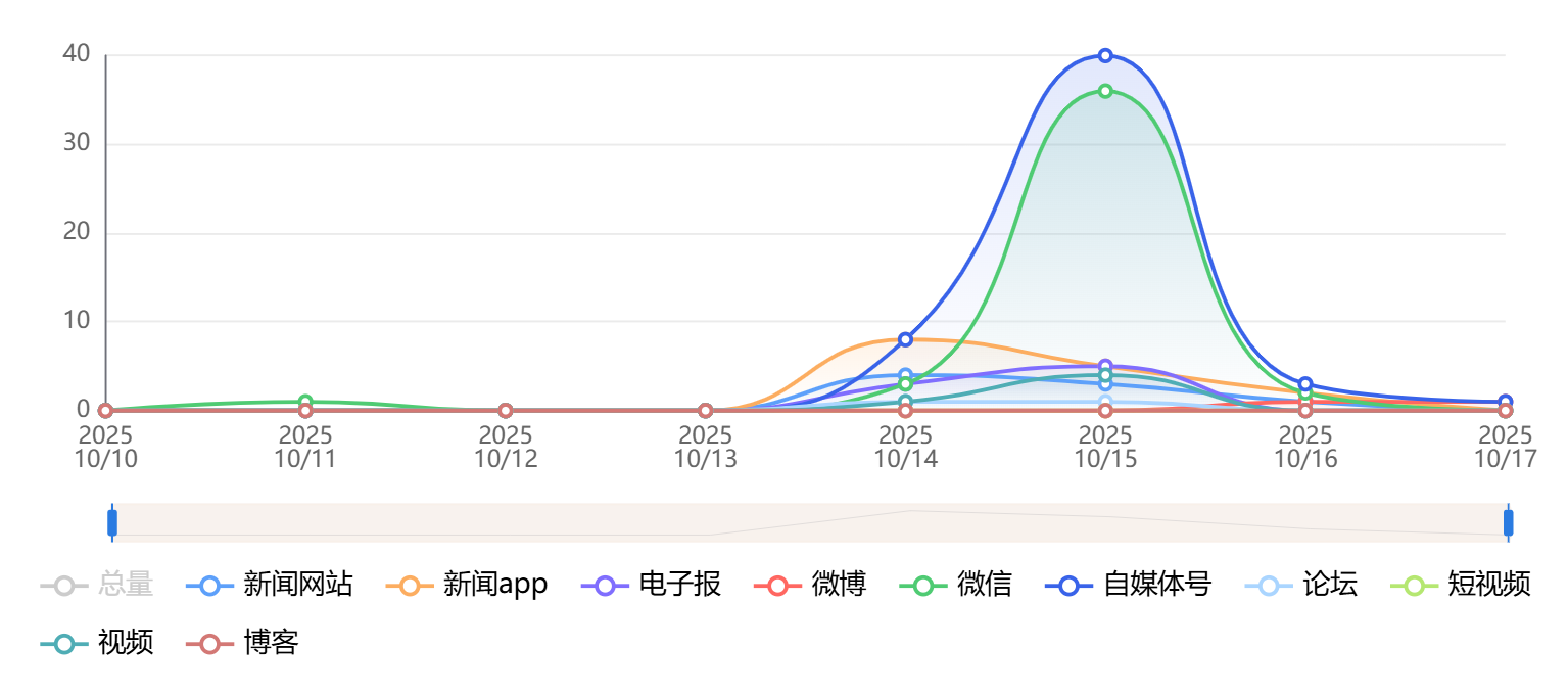 截至目前,该文章在互联网上传播总量为91篇,其中10月12日是信息发布的高峰期。各信源的信息发布情况中,自媒体号信息占比最大,其次是微信和新闻APP,信息量分别为34篇、26篇、14篇,占比分别为37.36%、28.57%、15.38%。(数据来源:新华睿思系统)