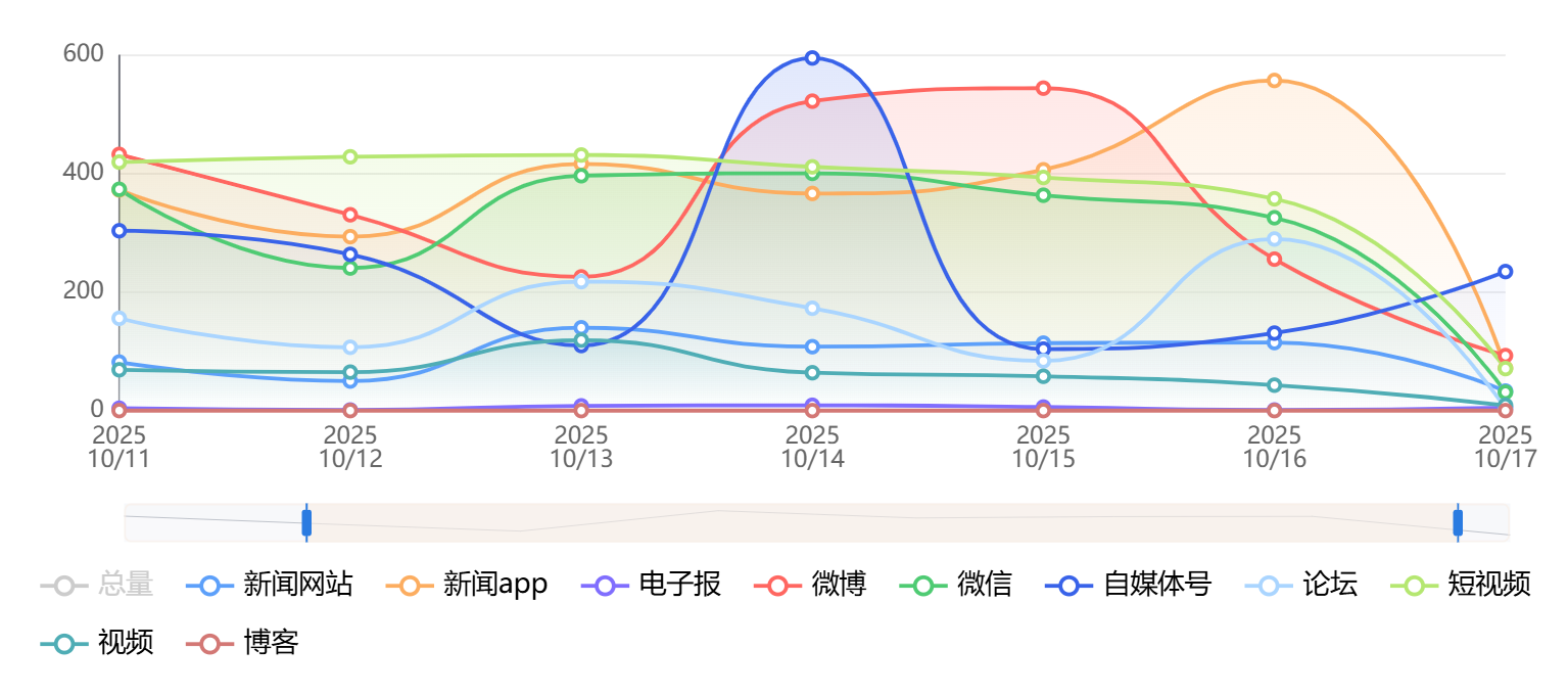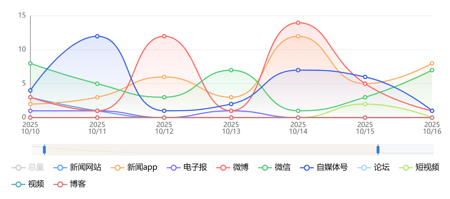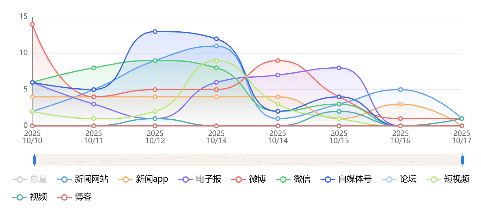截至目前,该文章在互联网上传播总量为1.35万篇,其中10月14日是信息发布的高峰期。各信源的信息发布情况中,自媒体号信息占比最大,其次是微博和新闻APP,信息量分别为3492篇、2949篇、1943篇,占比分别为25.87%、21.85%、14.4%。(数据来源:新华睿思系统)