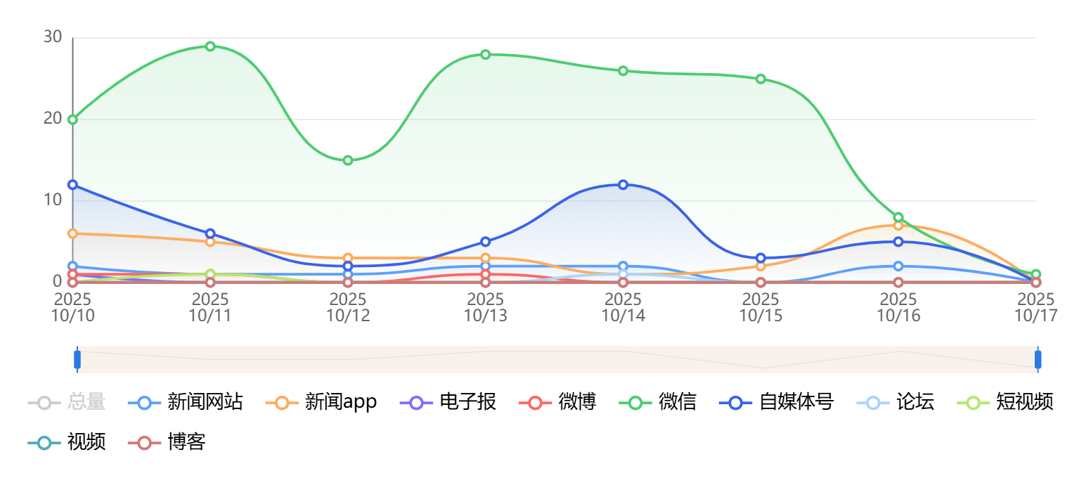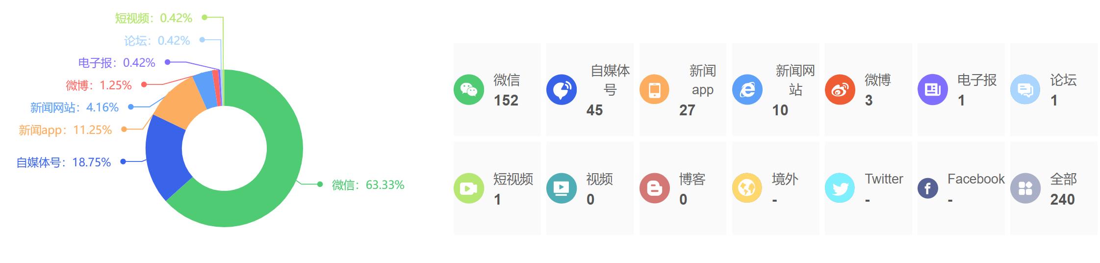 截至目前,该文章在互联网上传播总量为240篇,其中10月13日是信息发布的高峰期。各信源的信息发布情况中,微信信息占比最大,其次是自媒体号和新闻APP,信息量分别为152篇、45篇、27篇,占比分别为63.33%、18.75%、11.25%。(数据来源:新华睿思系统)