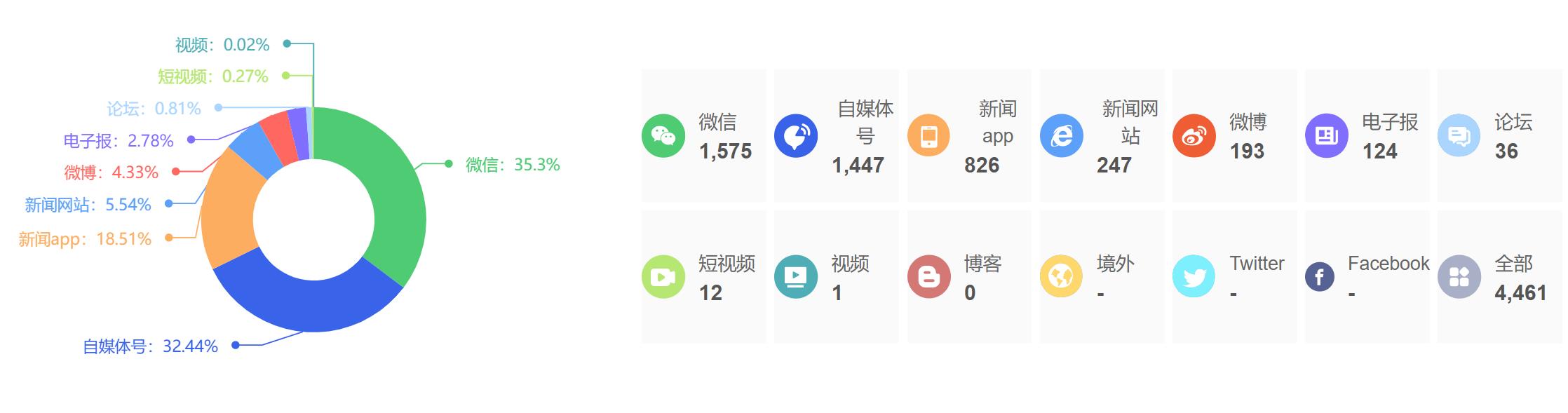 截至目前,该文章在互联网上传播总量为4461篇,其中10月13日是信息发布的高峰期。各信源的信息发布情况中,微信信息占比最大,其次是自媒体号和新闻APP,信息量分别为1575篇、1457篇、826篇,占比分别为35.3%、32.44%、18.51%。(数据来源:新华睿思系统)