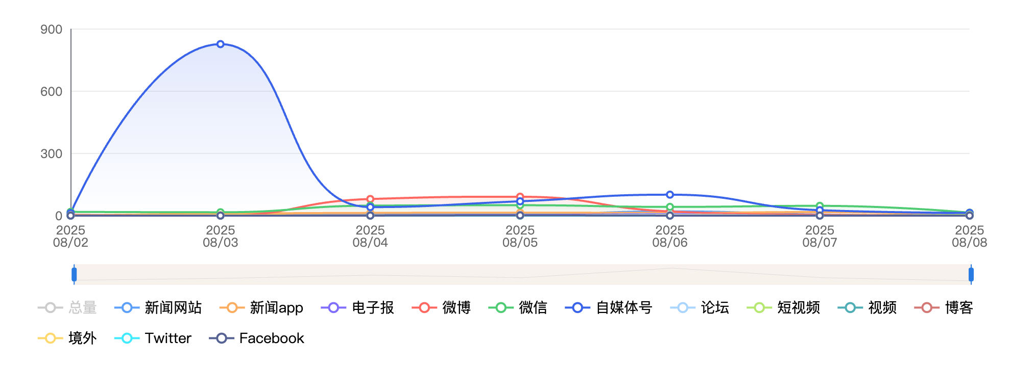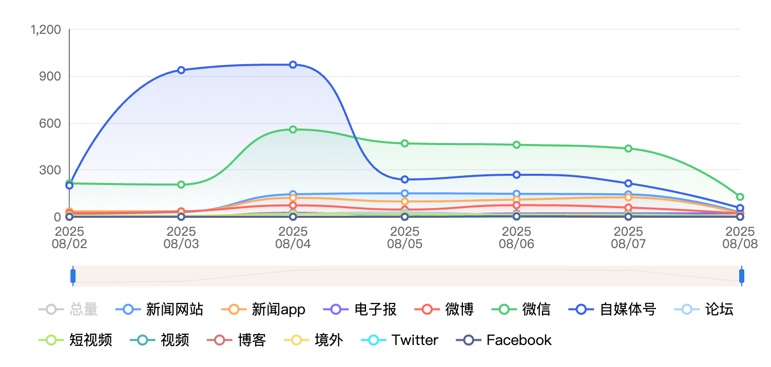 截至目前,该文章在互联网上传播总量为4201篇,其中8月7日是信息发布的高峰期。各信源的信息发布情况中,自媒体号信息占比最大,其次是微信和微博,信息量分别为2551篇、784篇、349篇,占比分别为60.72%、18.66%、8.31%。(数据来源:新华睿思系统)