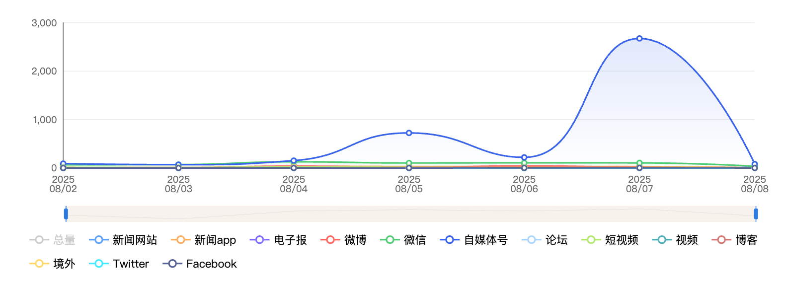 截至目前,该文章在互联网上传播总量为3407篇,其中8月3日是信息发布的高峰期。各信源的信息发布情况中,自媒体号信息占比最大,其次是微信和新闻网站,信息量分别为1417篇、1415篇、168篇,占比分别为41.59%、41.53%、4.93%。(数据来源:新华睿思系统)