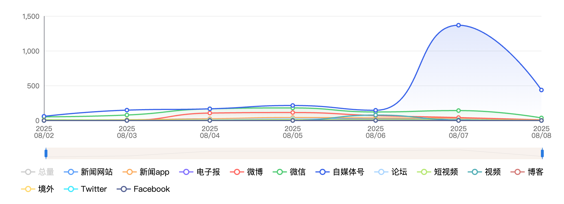 截至目前,该文章在互联网上传播总量为1670篇,其中8月3日是信息发布的高峰期。各信源的信息发布情况中,自媒体号信息占比最大,其次是微信和微博,信息量分别为1090篇、235篇、200篇,占比分别为65.27%、14.07%、11.98%。(数据来源:新华睿思系统)