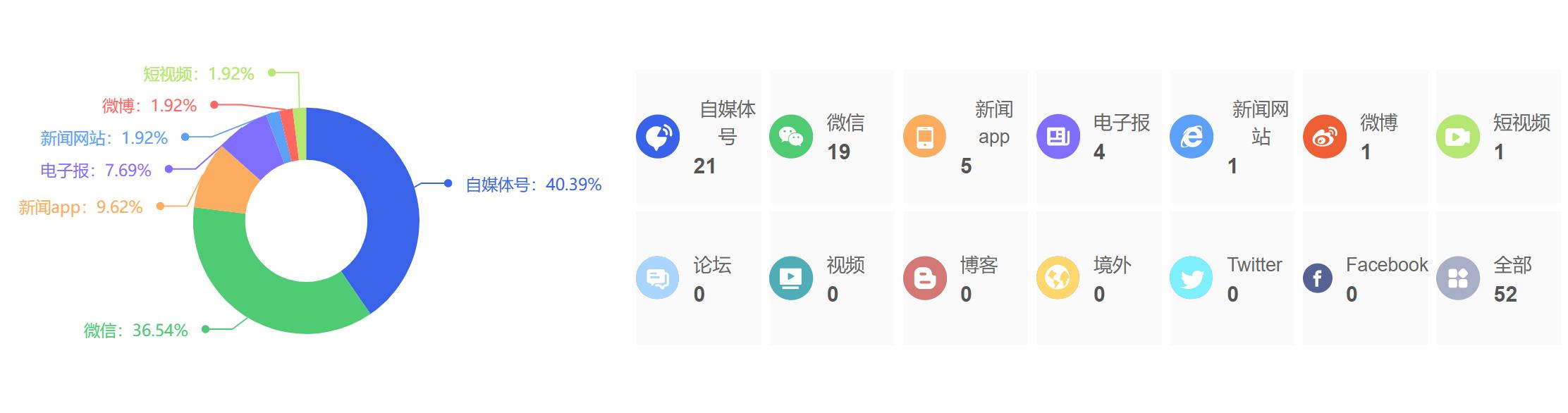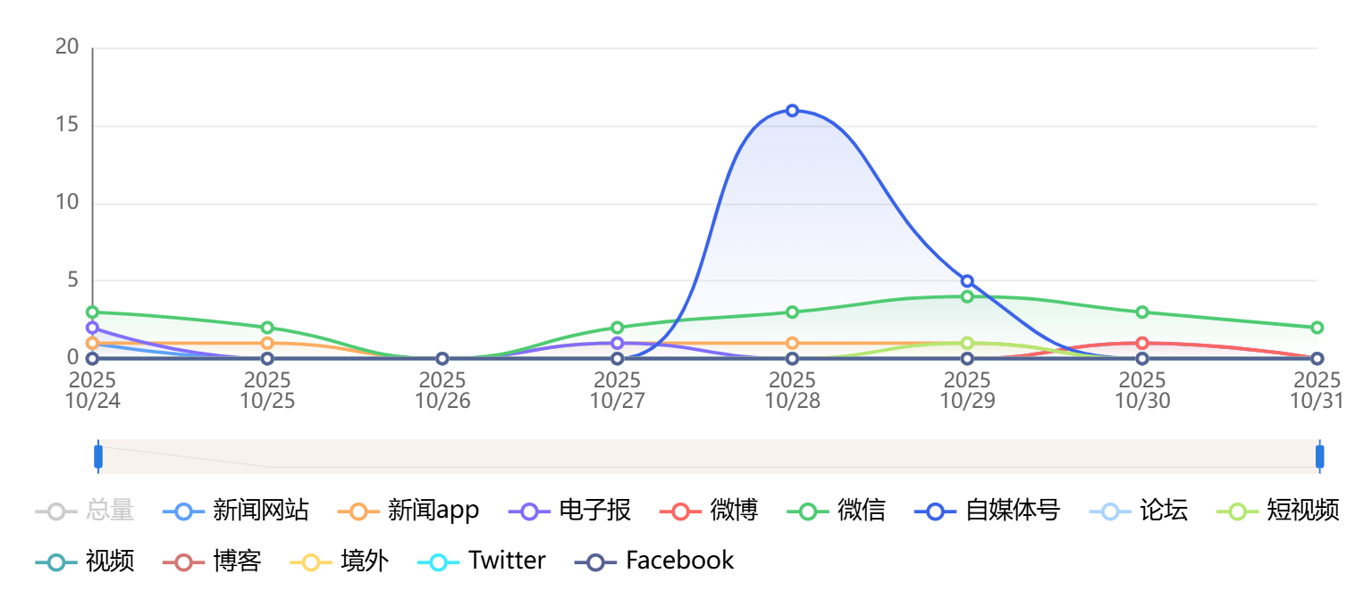 截至目前,该文章在互联网上传播总量为52篇,其中10月28日是信息发布的高峰期。各信源的信息发布情况中,自媒体号信息占比最大,其次是微信和新闻APP,信息量分别为21篇、19篇、5篇,占比分别为40.39%、36.54%、9.62%。(数据来源:新华睿思系统)