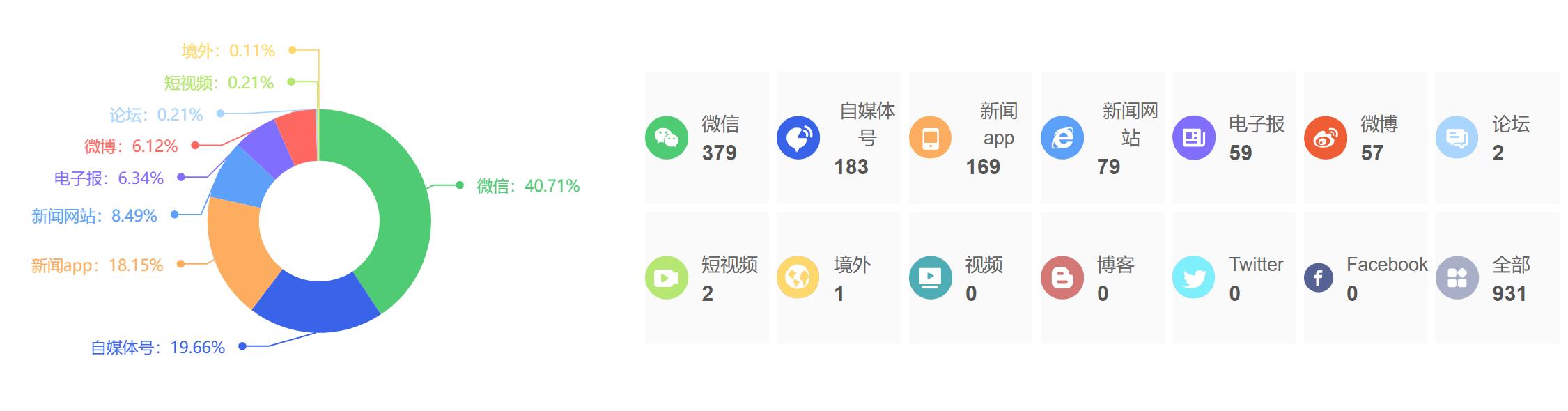 截至目前,该文章在互联网上传播总量为931篇,其中10月29日是信息发布的高峰期。各信源的信息发布情况中,微信信息占比最大,其次是自媒体号和新闻APP,信息量分别为379篇、183篇、169篇,占比分别为40.71%、19.66%、18.15%。(数据来源:新华睿思系统)