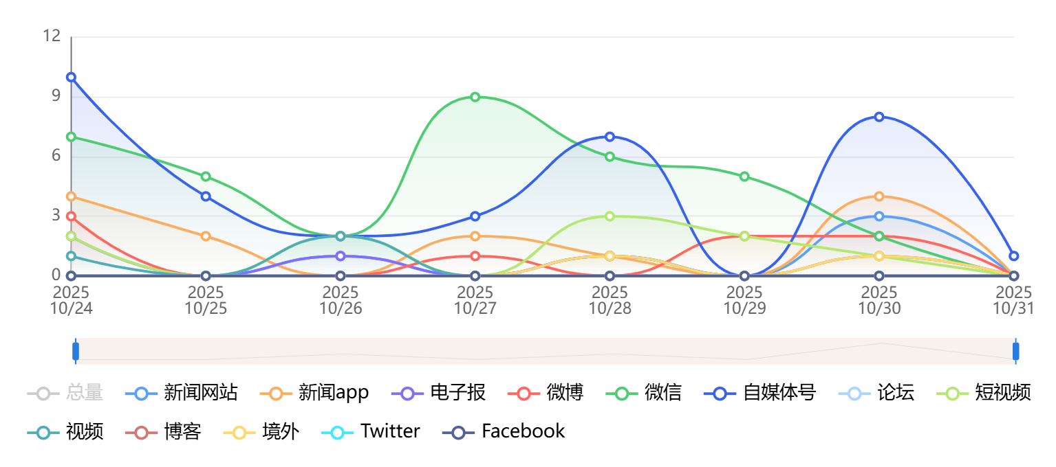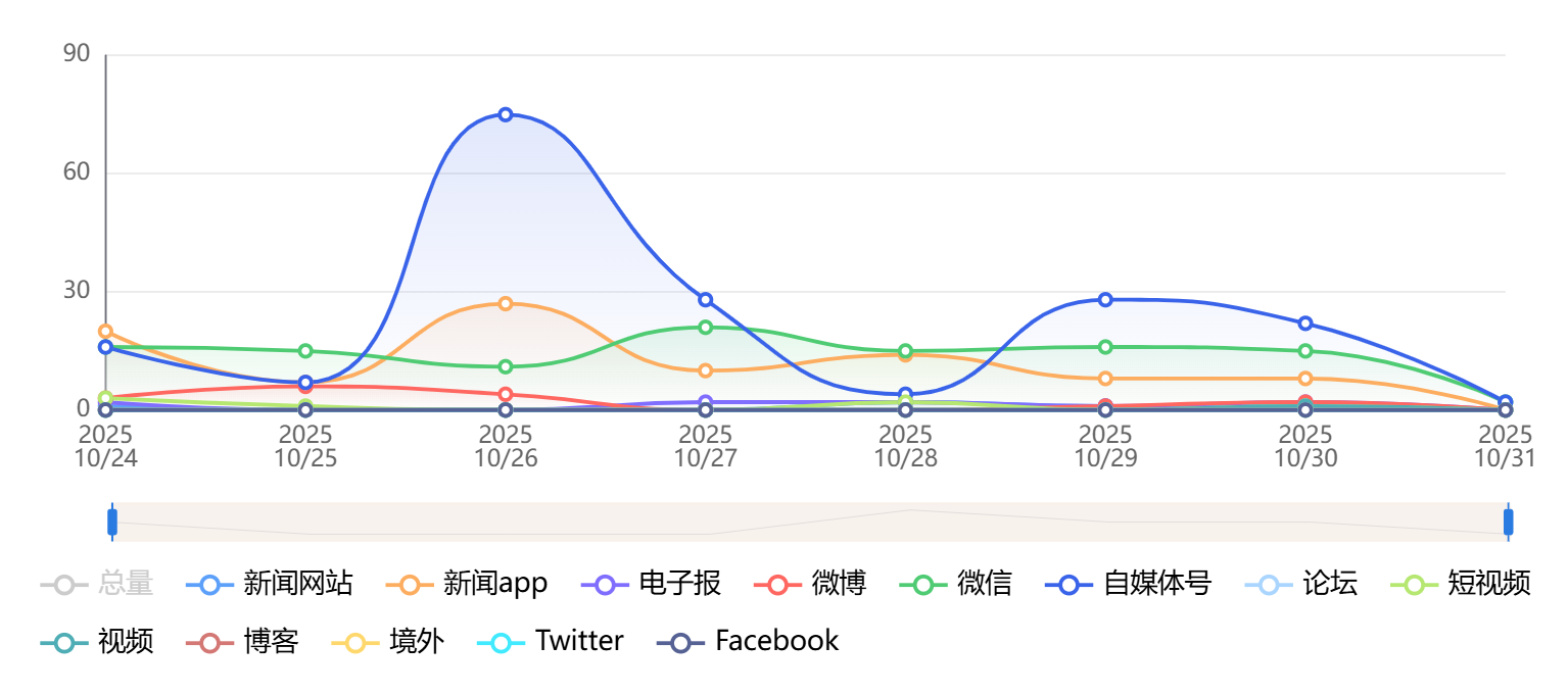 截至目前,该文章在互联网上传播总量为117篇,其中10月27日是信息发布的高峰期。各信源的信息发布情况中,微信信息占比最大,其次是自媒体号和新闻APP,信息量分别为36篇、35篇、13篇,占比分别为30.77%、29.92%、11.11%。(数据来源:新华睿思系统)