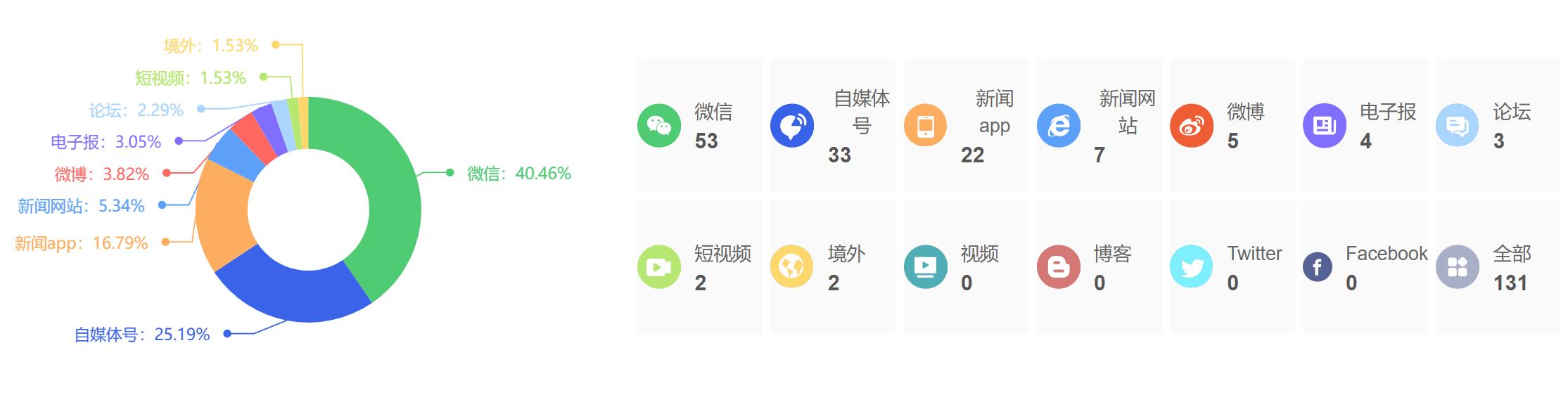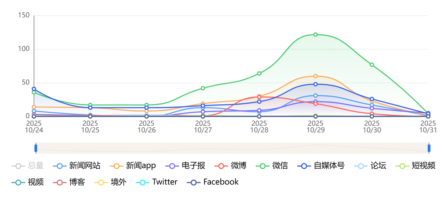 截至目前,该文章在互联网上传播总量为131篇,其中10月29日是信息发布的高峰期。各信源的信息发布情况中,微信信息占比最大,其次是自媒体号和新闻APP,信息量分别为53篇、33篇、22篇,占比分别为40.46%、25.19%、16.79%。(数据来源:新华睿思系统)